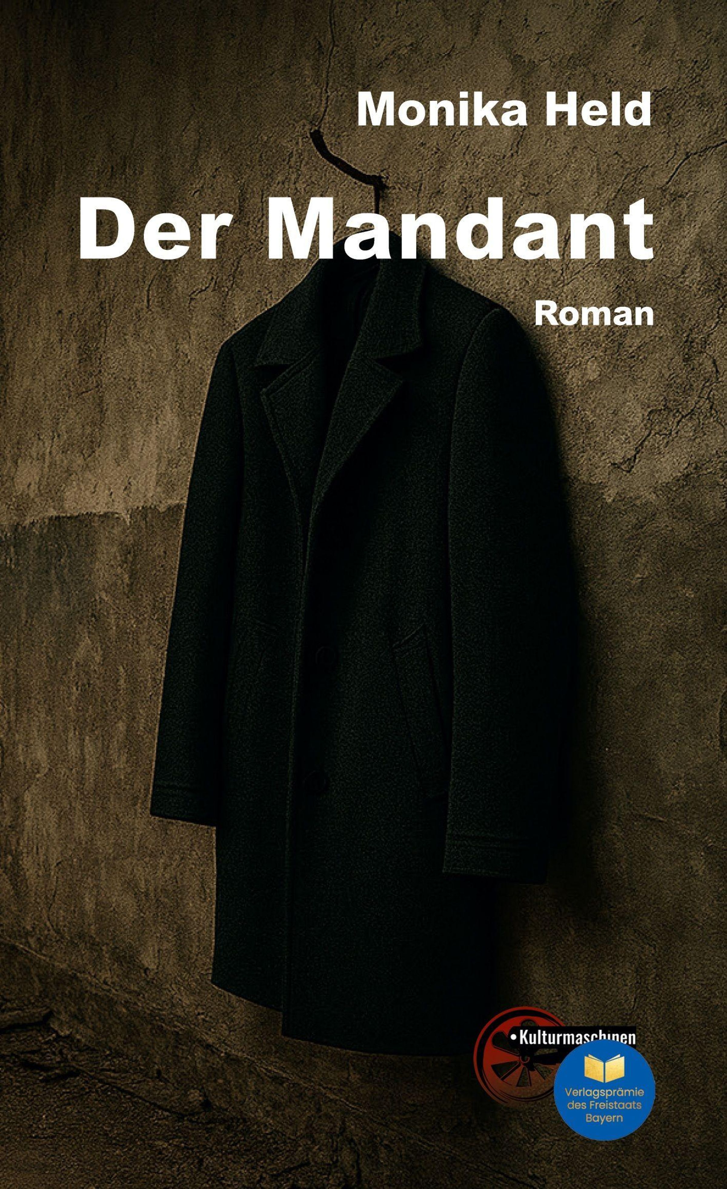 Text: "Monika Held, Der Mandant, Roman". Ein dunkler Mantel hängt an einer rauen Wand. Unten zwei Logos., Buch