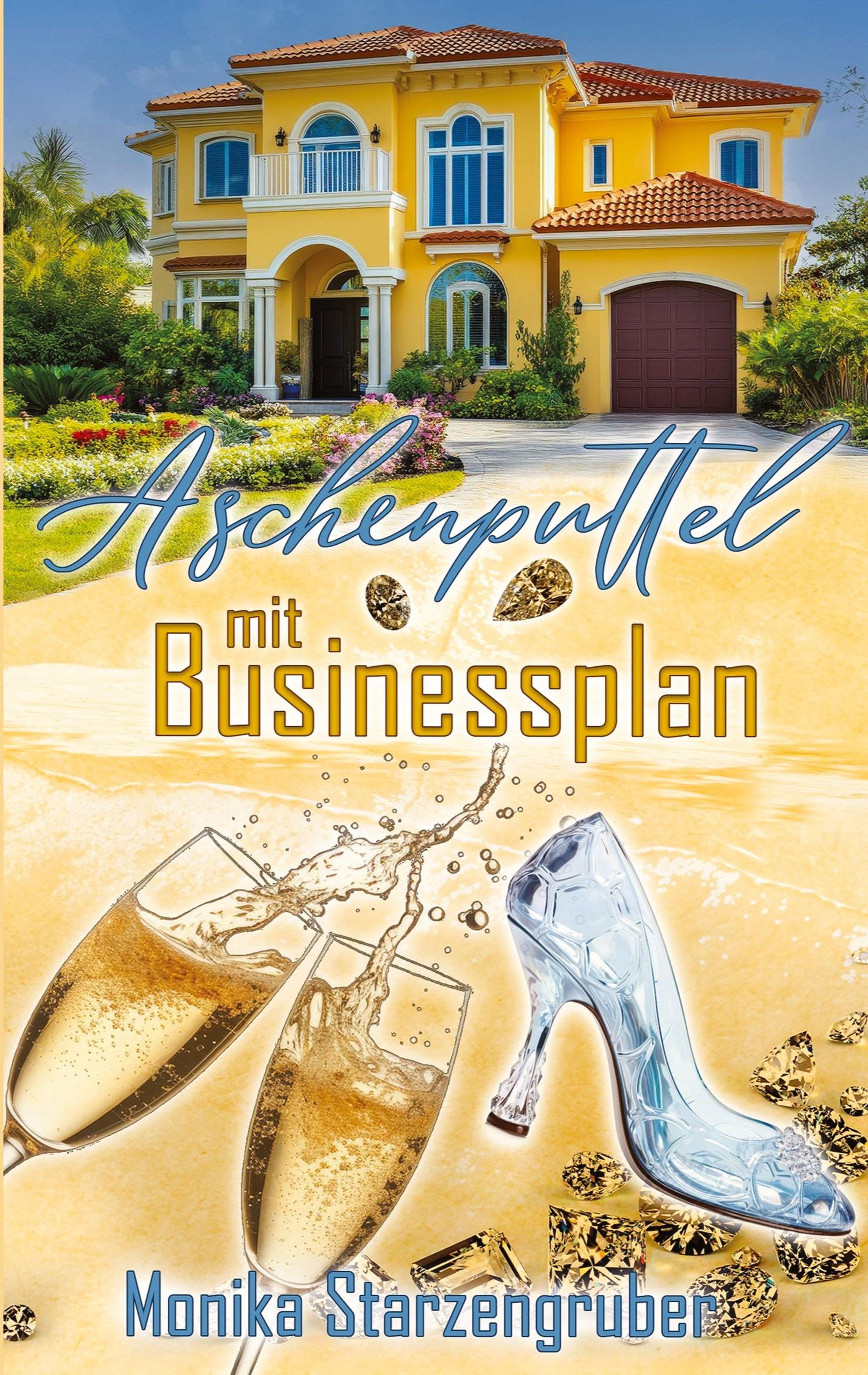 "Aschenputtel mit Businessplan" und "Monika Starzengruber". Palastartiges gelbes Haus, Sektgläser, gläserner Schuh, Goldakzente., Buch