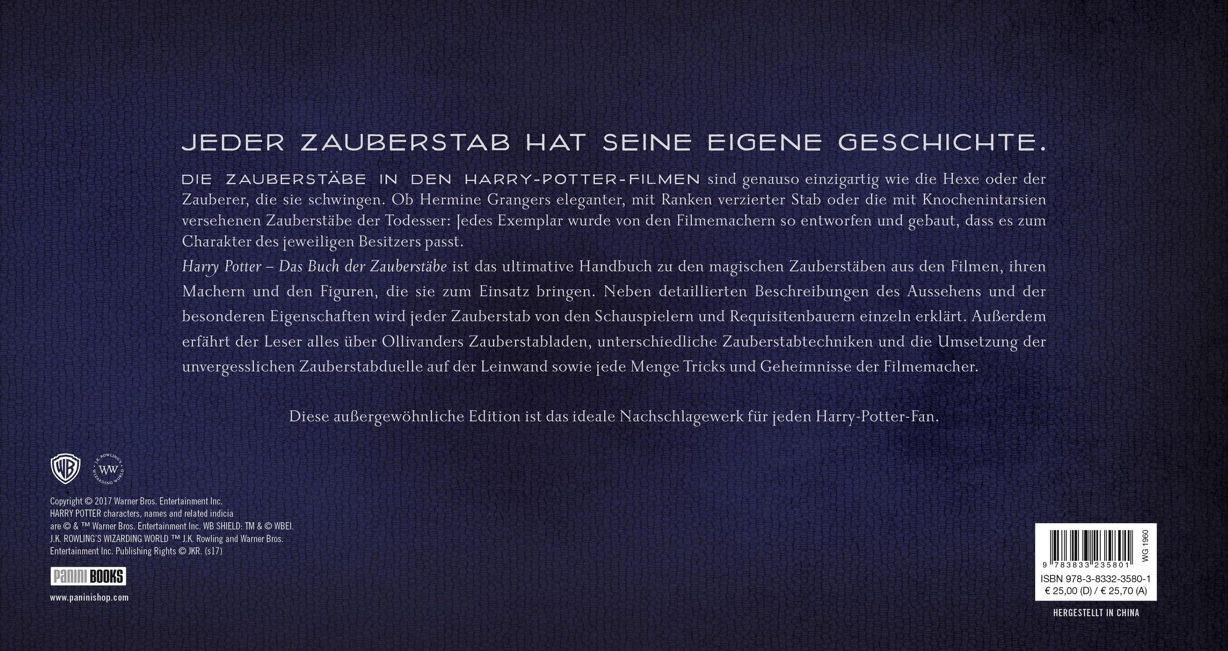 JEDER ZAUBERSTAB HAT SEINE EIGENE GESCHICHTE. DIE ZAUBERSTÄBE IN DEN HARRY-POTTER-FILMEN sind genauso einzigartig wie die Hexe oder der Zauberer, die sie schwingen. Ob Hermine Grangers eleganter, mit Ranken verzierter Stab oder die mit Knochenintarsien versehenen Zauberstäbe der Todesser: Jedes Exemplar wurde von den Filmemachern so entworfen und gebaut, dass es zum Charakter des jeweiligen Besitzers passt. Harry Potter - Das Buch der Zauberstäbe ist das ultimative Handbuch zu den magischen Zauberstäben aus den Filmen, ihren Machern und den Figuren, die sie zum Einsatz bringen. Neben detaillierten Beschreibungen des Aussehens und der besonderen Eigenschaften wird jeder Zauberstab von den Schauspielern und Requisitenbauern einzeln erklärt. Außerdem erfährt der Leser alles über Ollivanders Zauberstabladen, unterschiedliche Zauberstabtechniken und die Umsetzung der unvergesslichen Zauberstabduelle auf der Leinwand sowie jede Menge Tricks und Geheimnisse der Filmemacher.