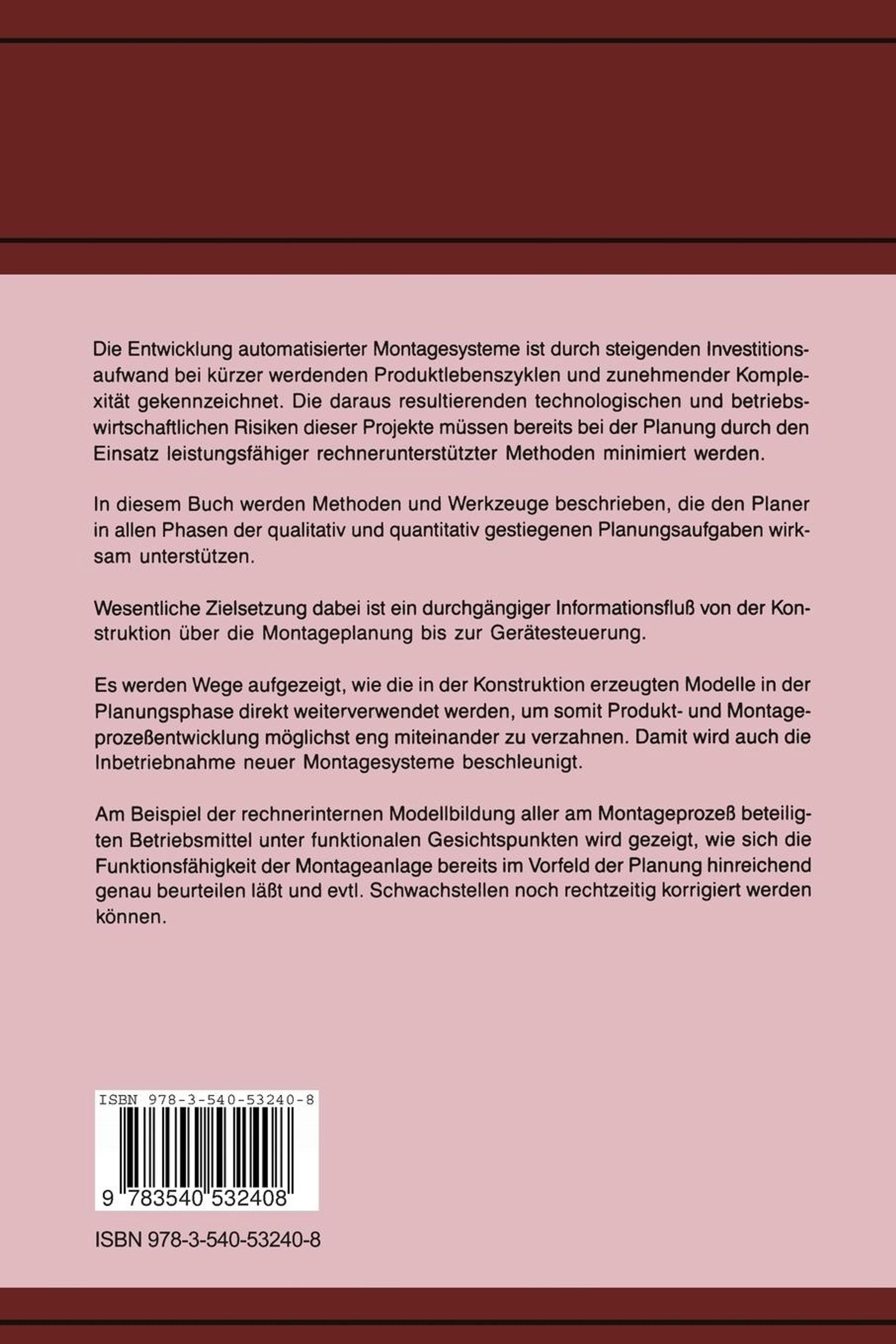 Das Buch beschreibt Methoden und Werkzeuge, die den Planer in allen Phasen der qualitativ und quantitativ gestiegenen Planungsaufgaben wirksam unterst}tzen. Am Beispiel der rechnerinternen Modellbildung aller am Mon- tageproze~ beteiligten Betriebsmittel wird gezeigt, wie sich die Funktionsf{higkeit der Montageanlage bereits im Vorfeld der Planung hinreichend genau beurteilen l{~t und evtl. Schwachstellen noch rechtzeitig korrigiert werden k|nnen. Wesentliche Zielsetzung ist ein durchg{ngiger Informations- flu~ von der Konstruktion }ber die Montageplanung bis zur Ger{testeuerung. Es wird gezeigt, wie die in der Konstruk- tion erarbeiteten Modelle in der Planungsphase direkt wei- terverwendet werden, um Produkt- und Montageproze~entwick- lung m|glichst eng miteinander zu verzahnen. Damit wird auch die Inbetriebnahme neuer Montagesysteme beschleunigt.