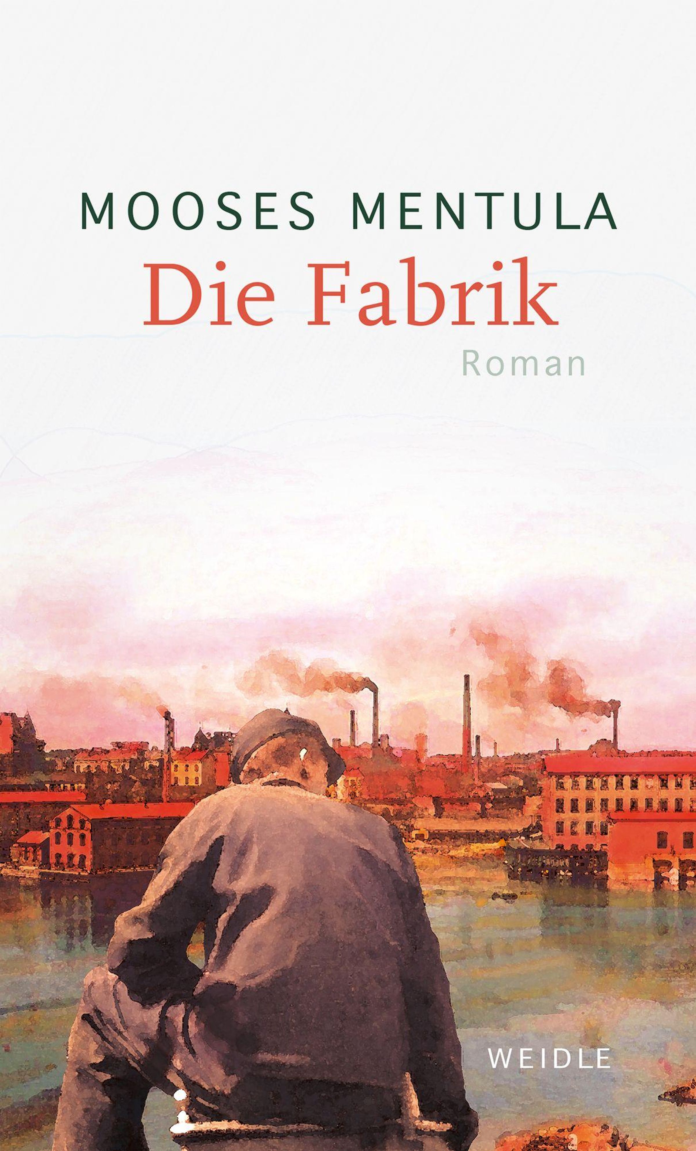 Oben: "Mooses Mentula, Die Fabrik, Roman". Unten: Ein Mann von hinten, vor rauchenden Fabriken am Wasser., Buch