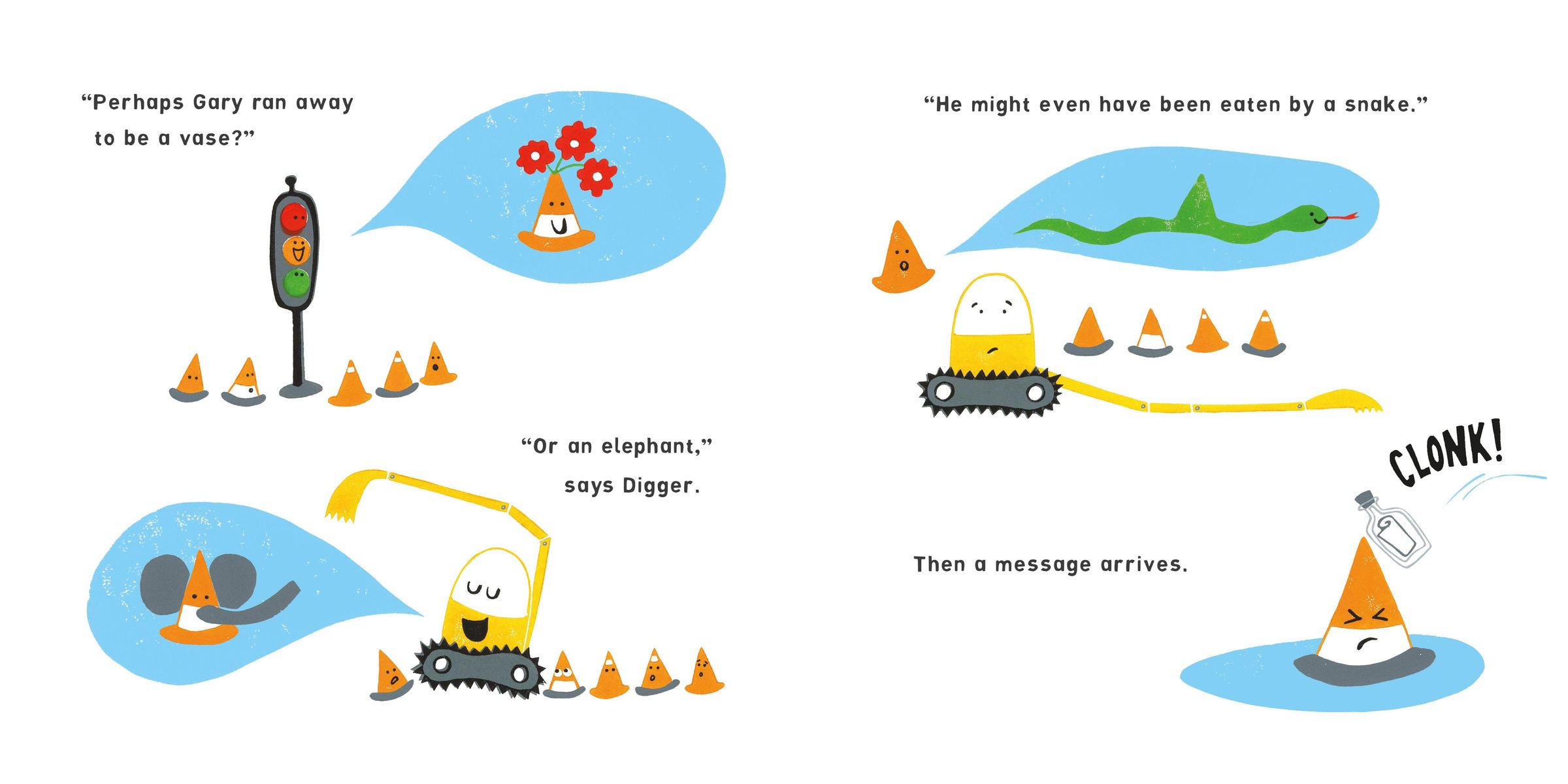 Digger, Traffic Light and the cones are all ready to start the roadworks one morning when they notice that something's wrong . . . Gary the traffic cone is missing! And It's a disaster! They search left and right, high and low, but it's no use. Can they find Gary all by themselves? Or do they need to ask for help? What's going to happen when they find him?