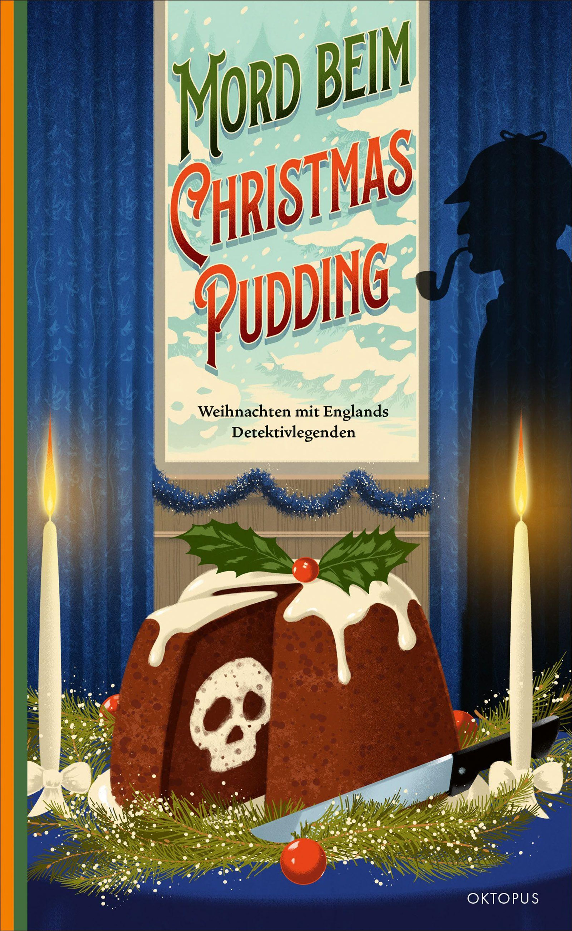 Eine Illustration zeigt einen Pudding mit Totenkopf-Muster. Links und rechts brennen Kerzen, oben ist ein Detektiv im Profil., Buch