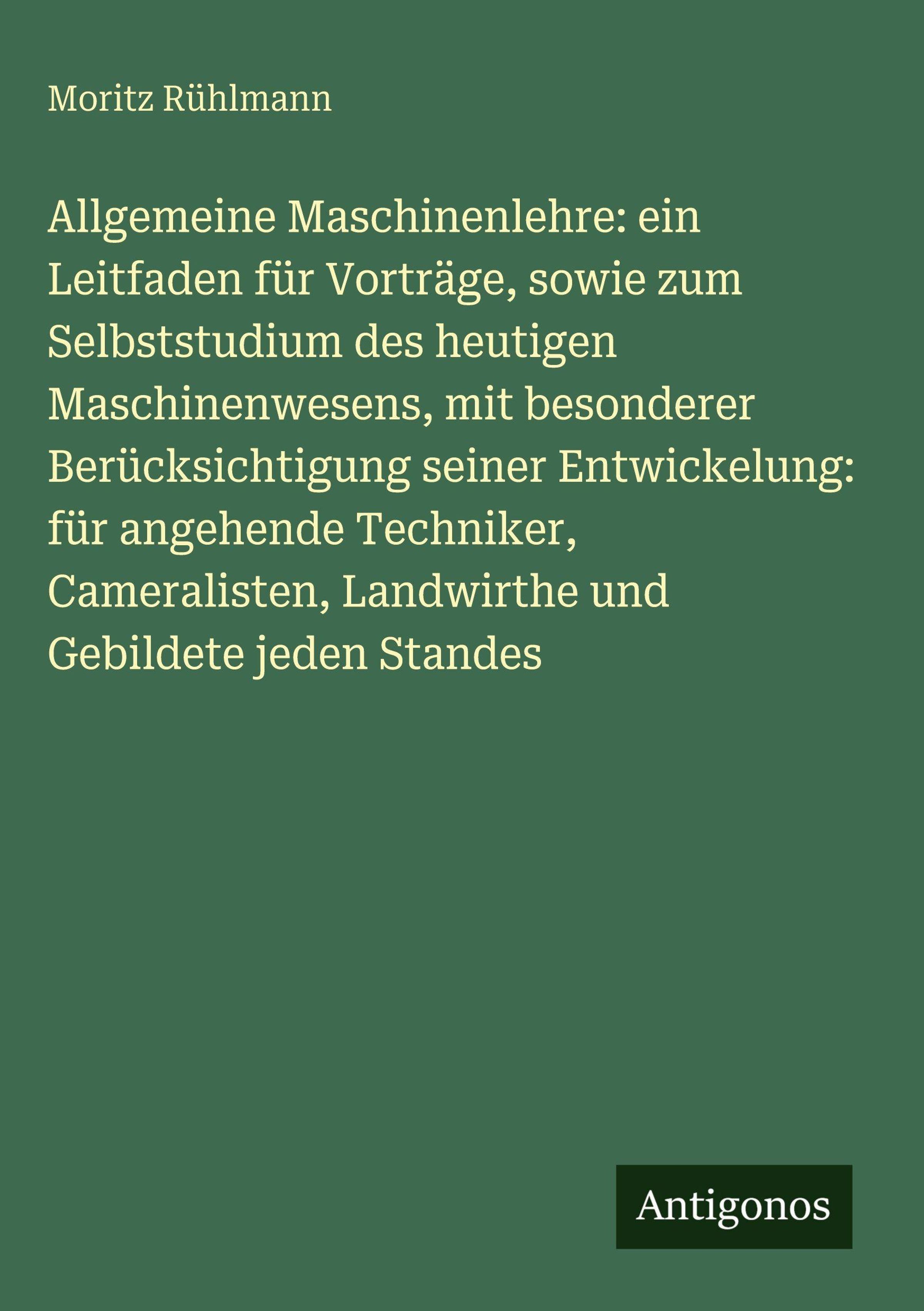 Allgemeine Maschinenlehre: ein Leitfaden für Vorträge, sowie zum Selbststudium des heutigen Maschinenwesens, mit besonderer Berücksichtigung seiner Entwickelung: für angehende Techniker, Cameralisten, Landwirthe und Gebildete jeden Standes