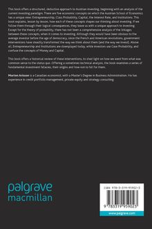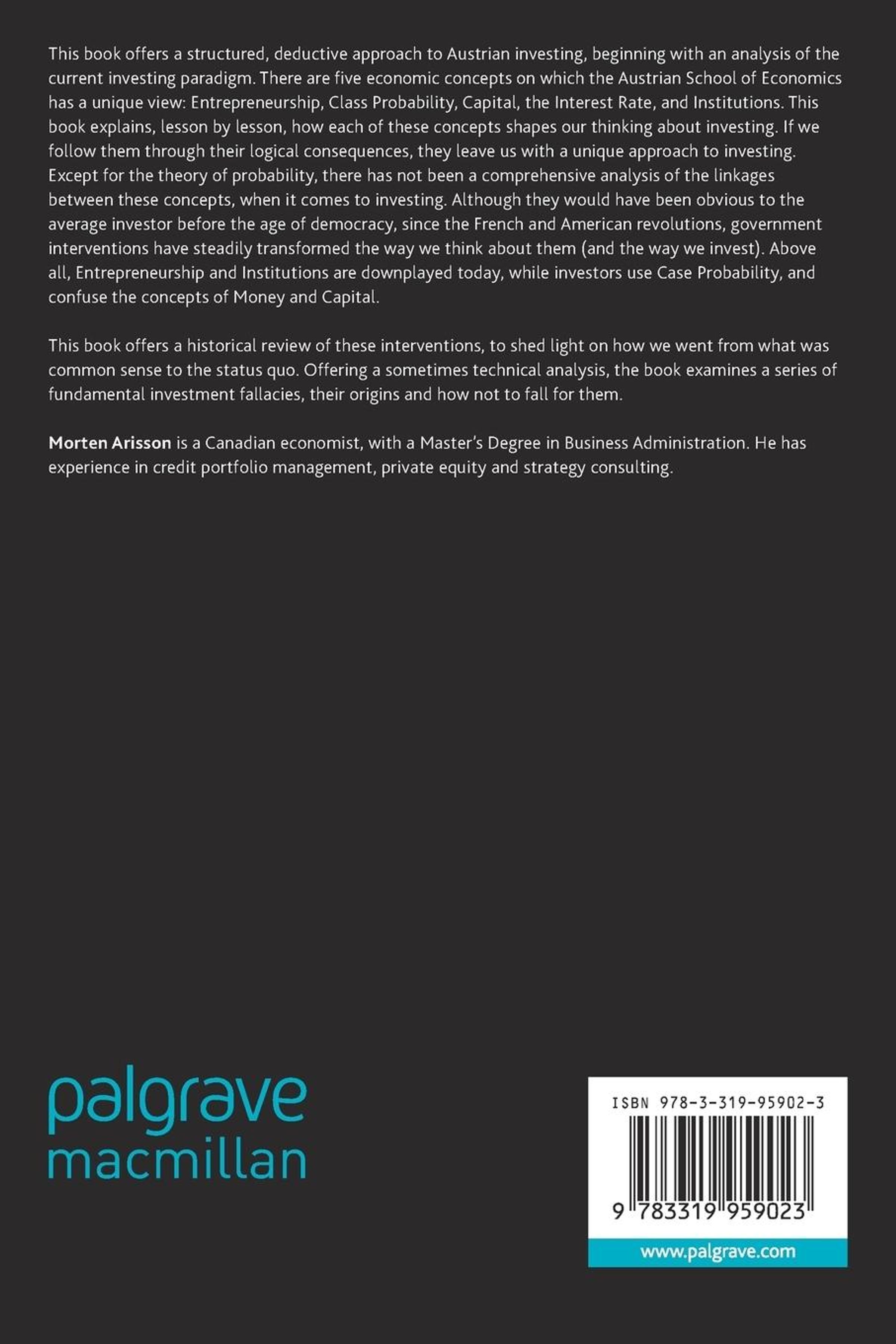 This book offers a structured, deductive approach to Austrian investing, beginning with an analysis of the current investing paradigm. There are five economic concepts on which the Austrian School of Economics has a unique view: Entrepreneurship, Class Probability, Capital, the Interest Rate, and Institutions. This book explains, lesson by lesson, how each of theseshapes our thinking about investing. If we follow them through their logical consequences, they leave us with a unique approach to investing. Except for the theory of probability, there has not been a comprehensive analysis of the linkages between these concepts, when it comes to investing. Although they would have been obvious to the average investor before the age of democracy, since the French and American revolutions, government interventions have steadily transformed the way we think about them (and the way we invest). Above all, Entrepreneurship and Institutions are downplayed today, while investors use Case Probability, and confuse the concepts of Money and Capital. This book offers a historical review of these interventions, to shed light on how we went from what was common sense to the status quo. Offering a sometimes technical analysis, the book examines a series of fundamental investment fallacies, their origins and how not to fall for them.