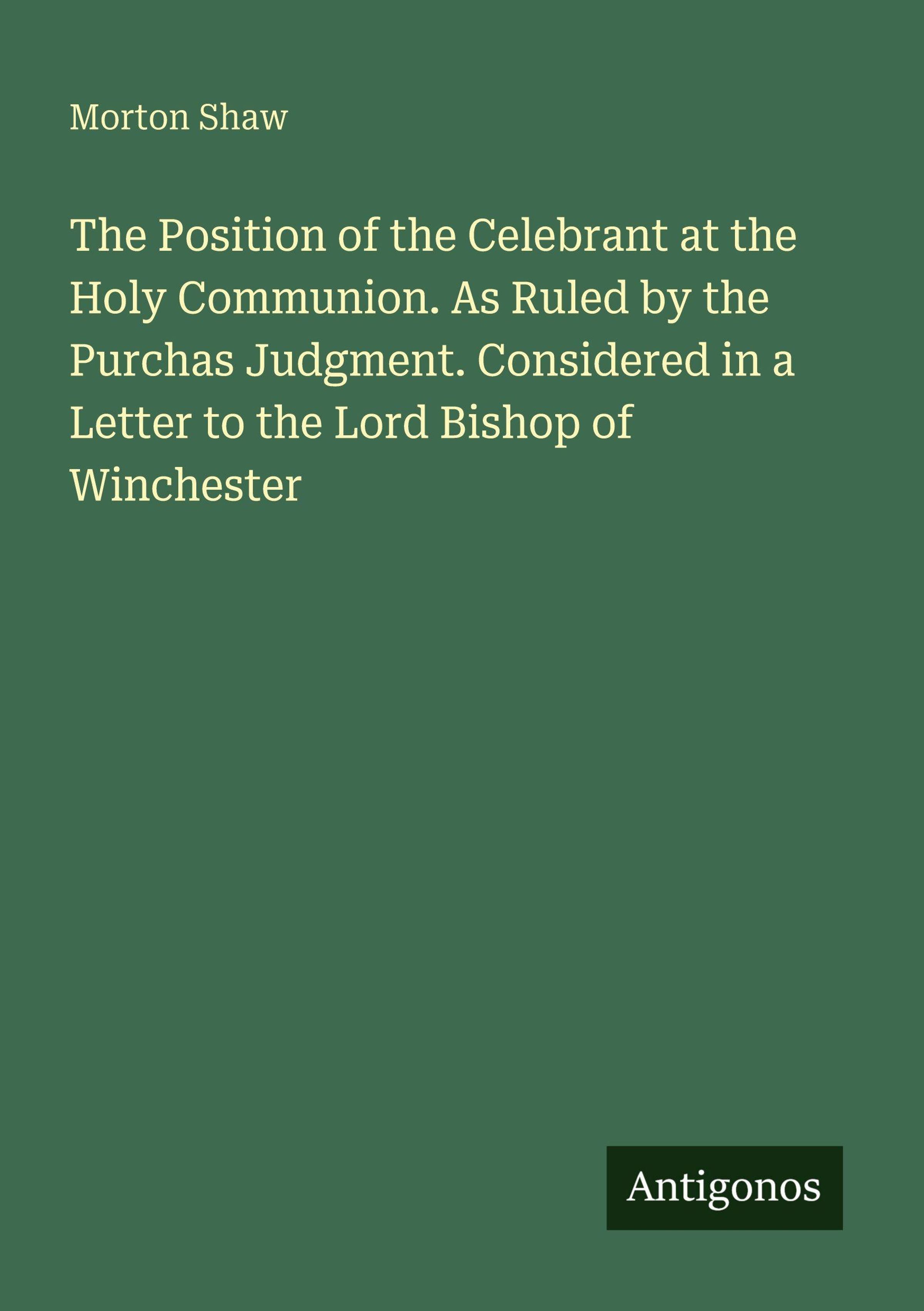 The Position of the Celebrant at the Holy Communion. As Ruled by the Purchas Judgment. Considered in a Letter to the Lord Bishop of Winchester