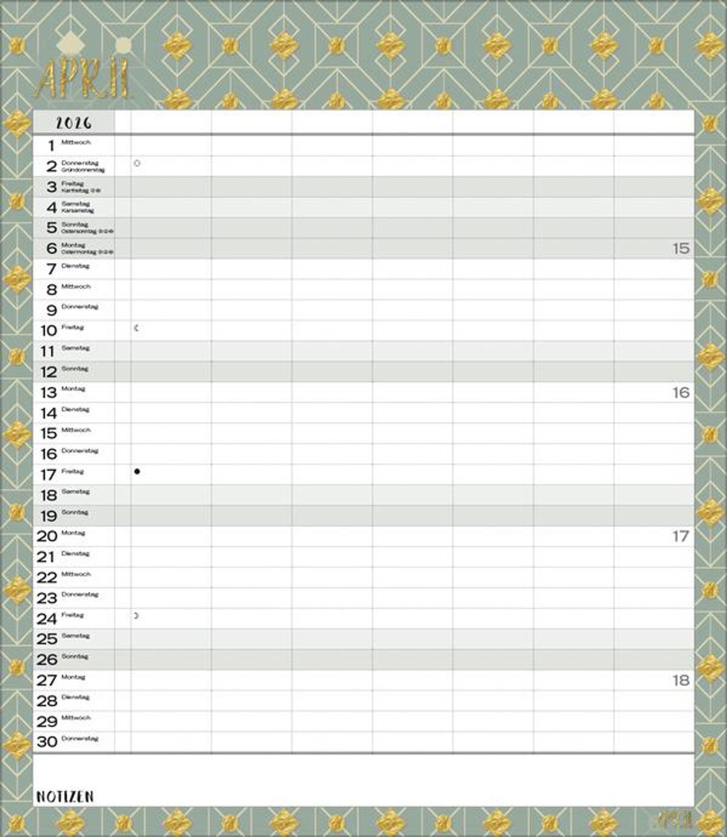 - Terminkalender mit viel Platz für Eintragungen, ohne störende Bilder in den Spalten