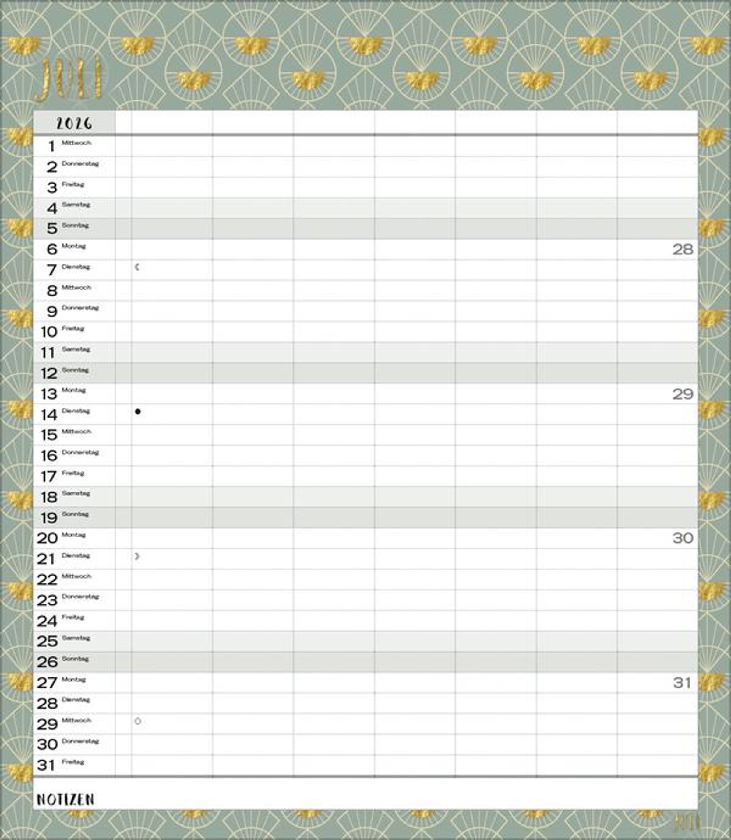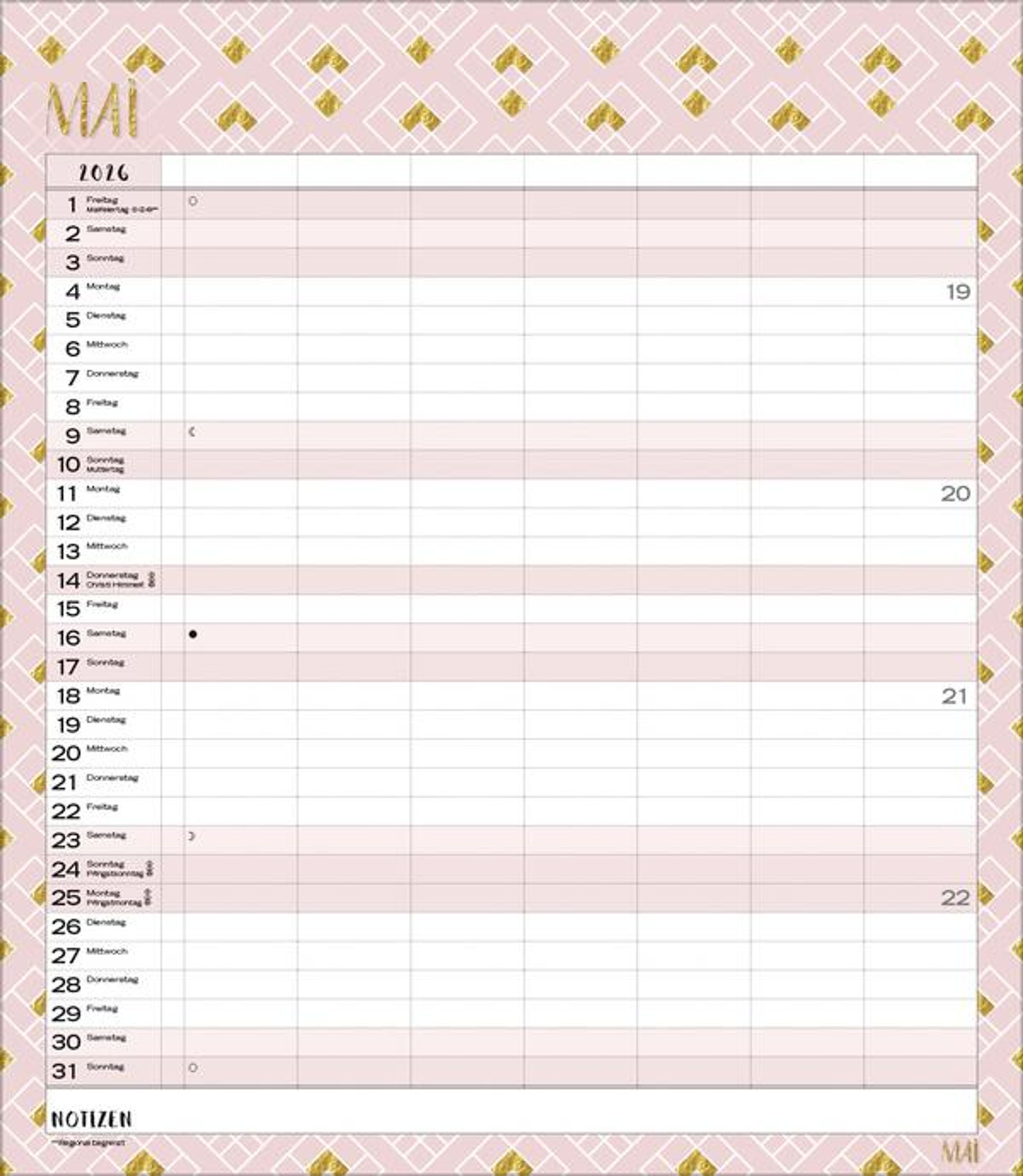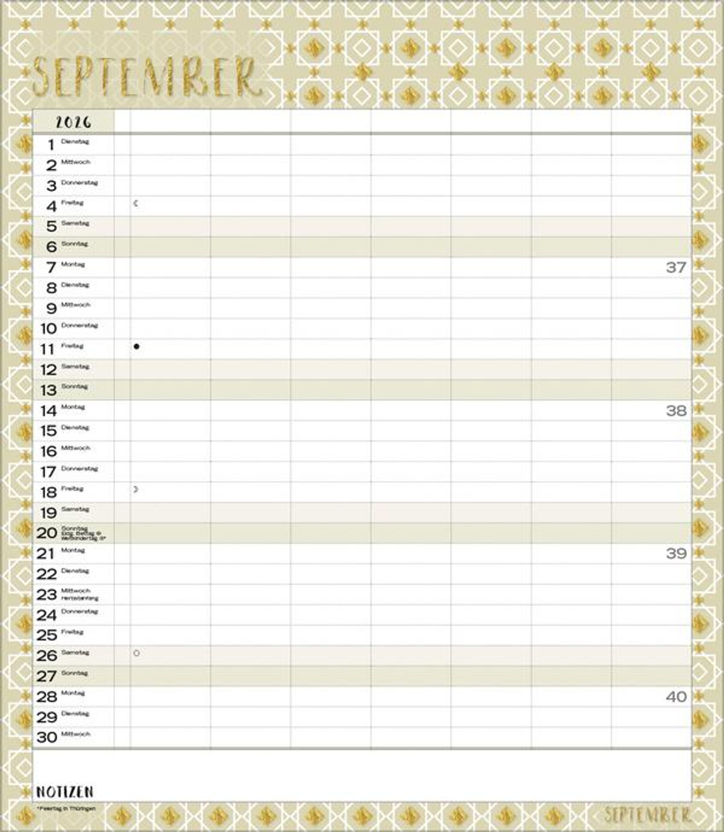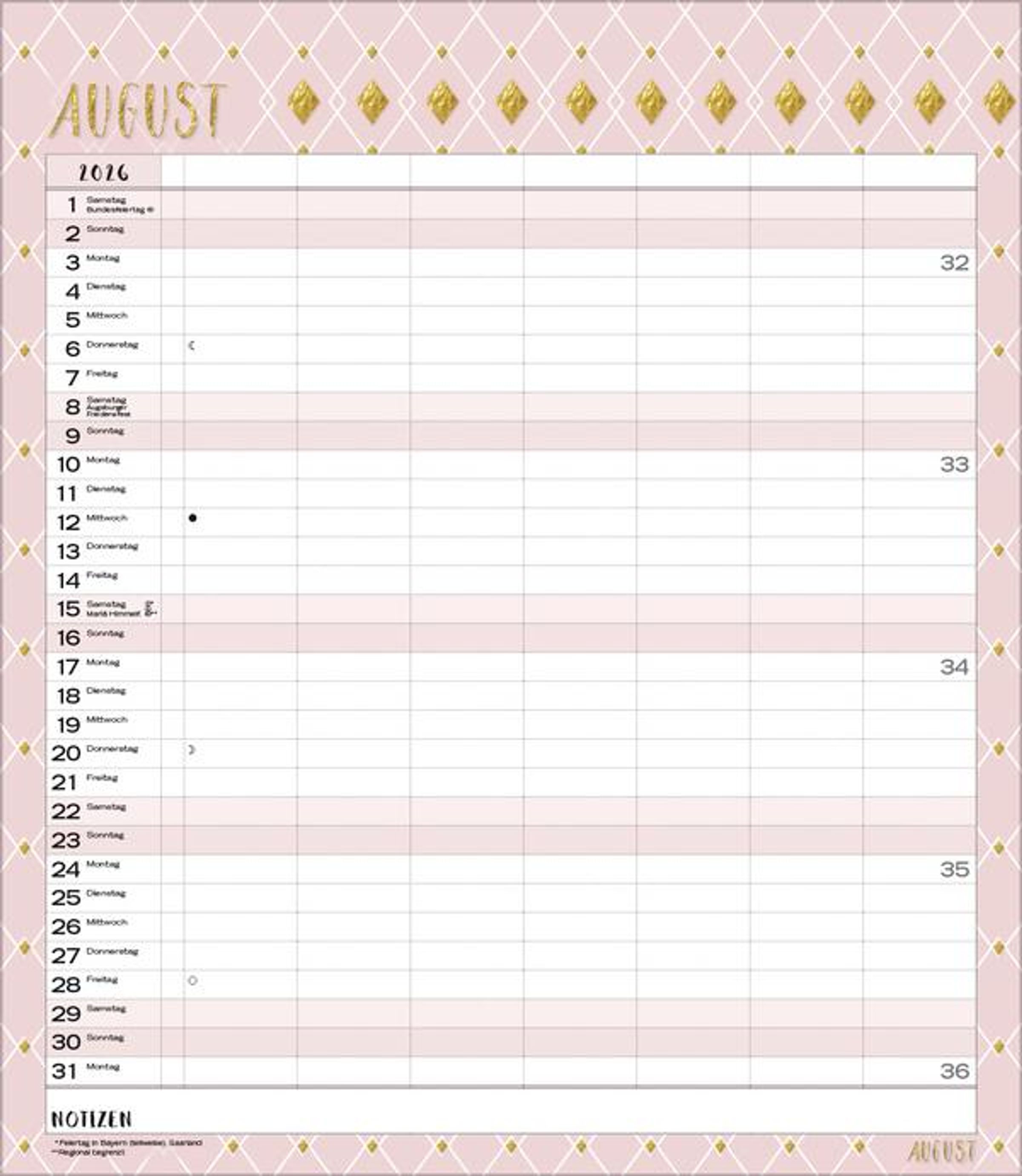 Weitere Informationen wie Mondphasen, Ferientermine und Feiertage (auch regionale) sowie deutlich lesbare Kalenderwochen runden den Kalender ab und sorgen für einen vollständigen Überblick Ihres Jahres.