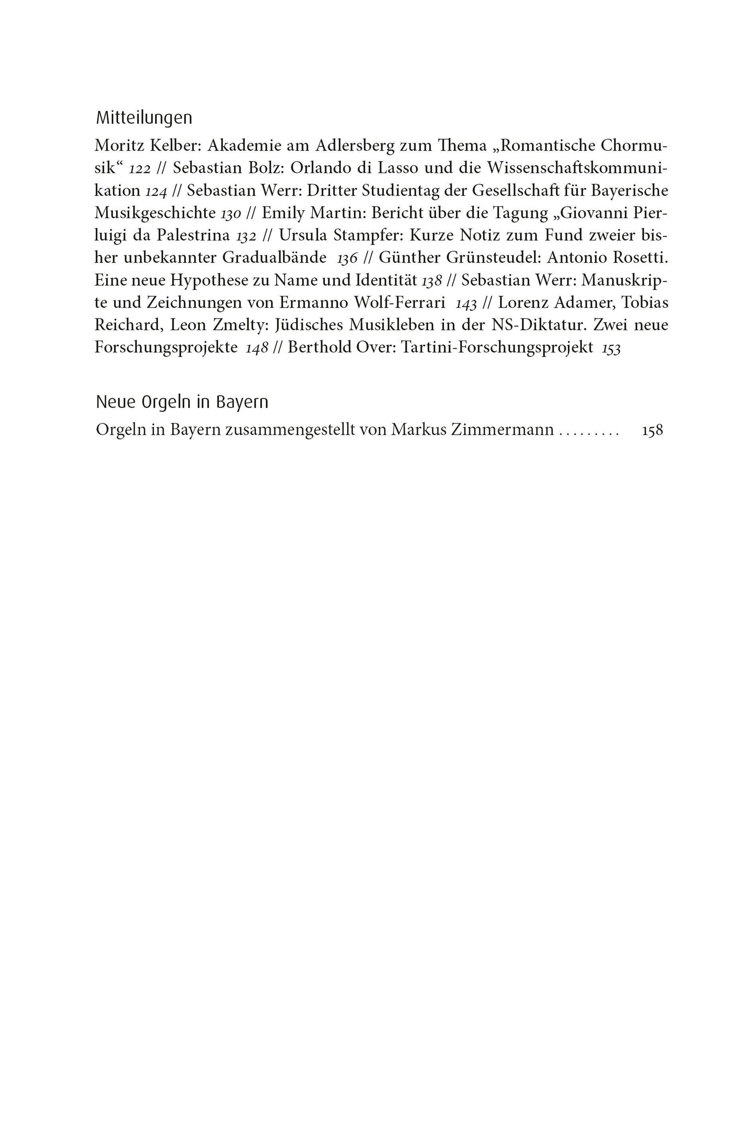 Aus dem Inhalt: Angelika Tasler Dringender Forschungsbedarf - offene Fragen zum Coburger Hofkapellmeister Melchior Franck (¿ 1639) Katharina Preller Die Musikalienverzeichnisse aus Rothenburg ob der Tauber (1657-1697) - Einblicke in das Musikleben einer fränkischen Reichsstadt¿ Sebastian Werr Die Münchner Lieblings-Stücke neuester Zeit für Piano-Forte allein von Joseph Aibl - Zur Kulturgeschichte des häuslichen Musizierens in Bayern um 1850¿ Egon Voss Karl Amadeus Hartmanns Vita Nova - Beobachtungen an den Quellen¿ Johanna Bulitta Hans Werner Henze und die Anfänge der Münchener Biennale für neues Musiktheater