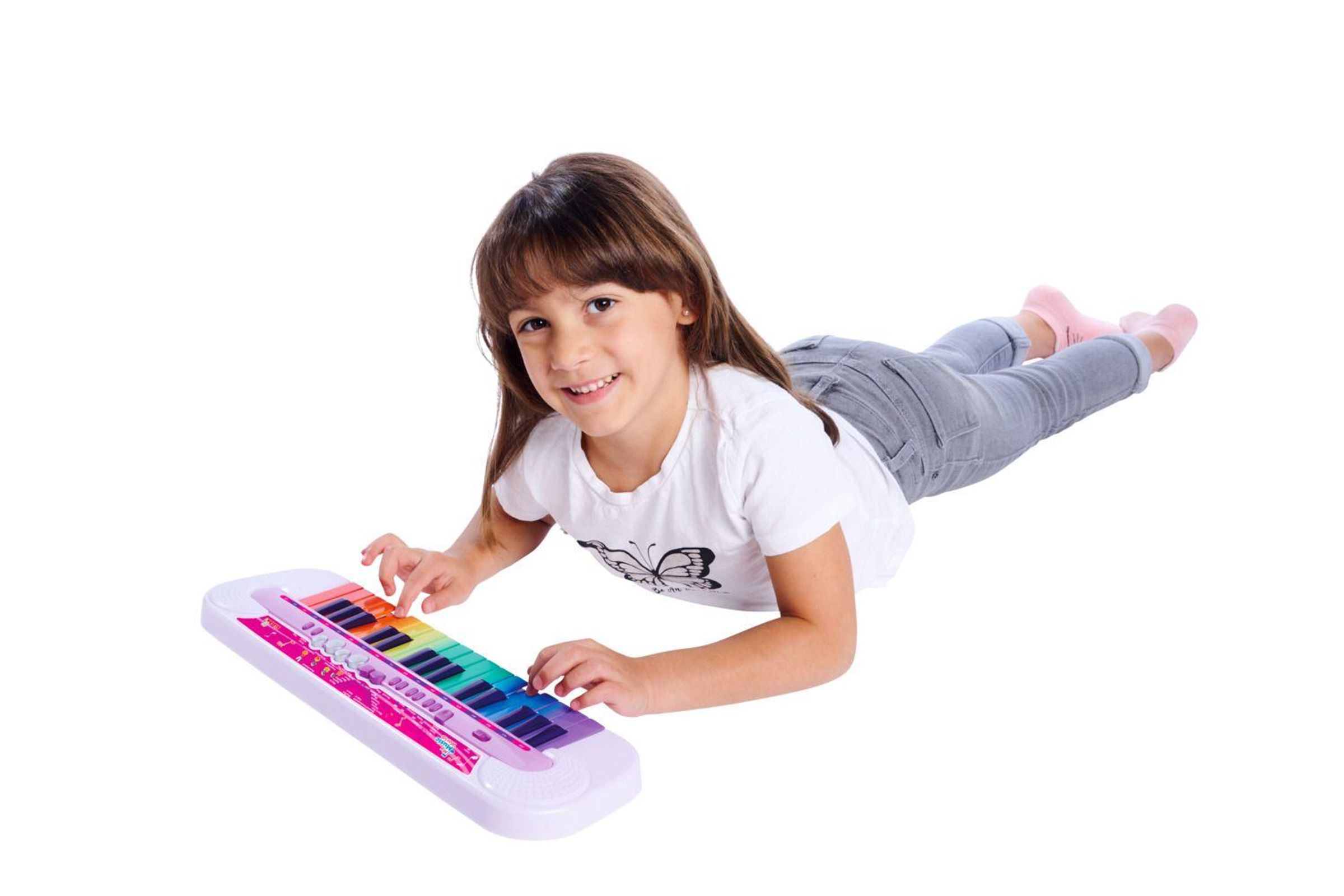 Keyboard mit Funktionen - Ausgestattet ist das 45x13cm großes Keyboard mit 32 farbigen Regenbogentasten und einer Auswahl an 8 Demos und 6 Rhythmen.