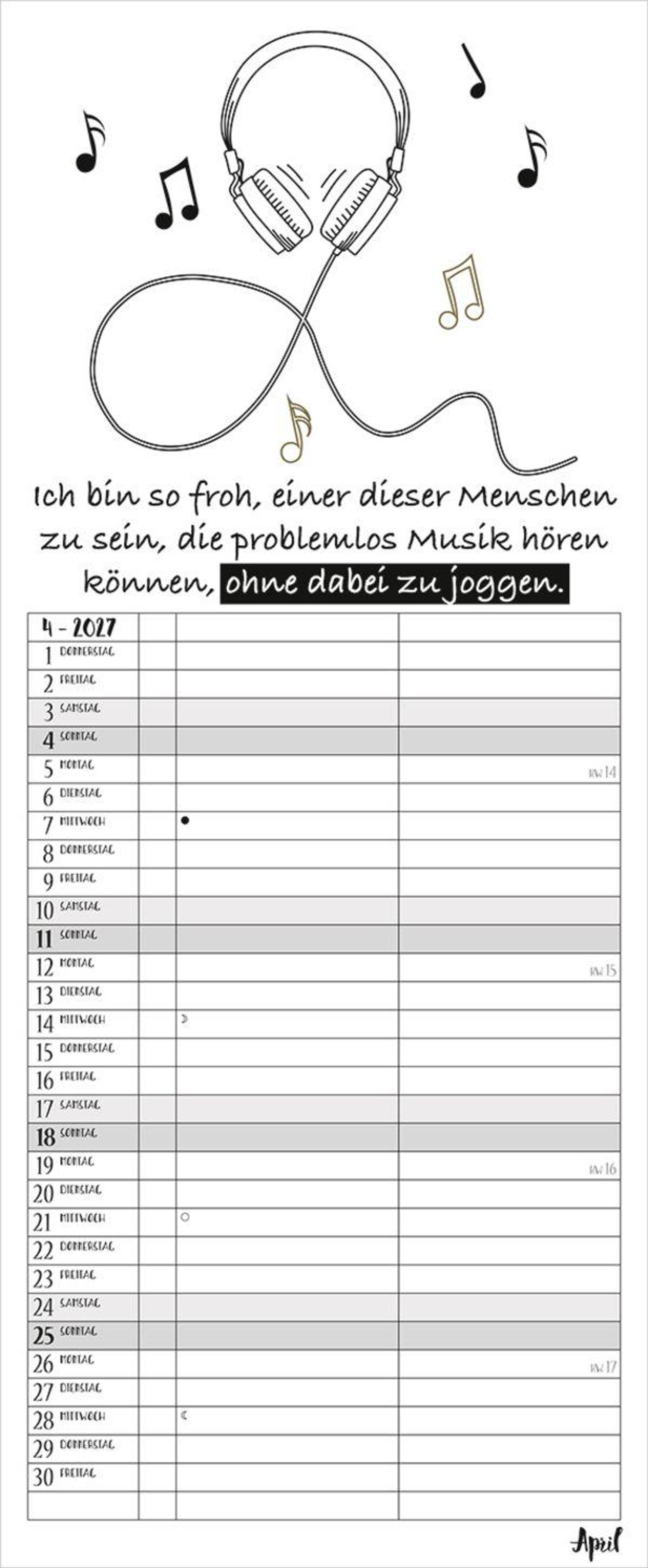 Der trendige Lifestyle-Kalender für alle TypoArt-Fans! Mit 12 witzigen Sprüchen und coolen Statements rund ums Leben. Schwarz-Weiß-Design kombiniert mit Metallic-Goldfarbe setzt Ihre Termine gekonnt in Szene. Zugleich profitieren Sie von der hohen Funktionalität eines modernen Terminplaners: 2 Spalten, Kalendarium, Ferientermine und Vorschau bis März des Folgejahres.