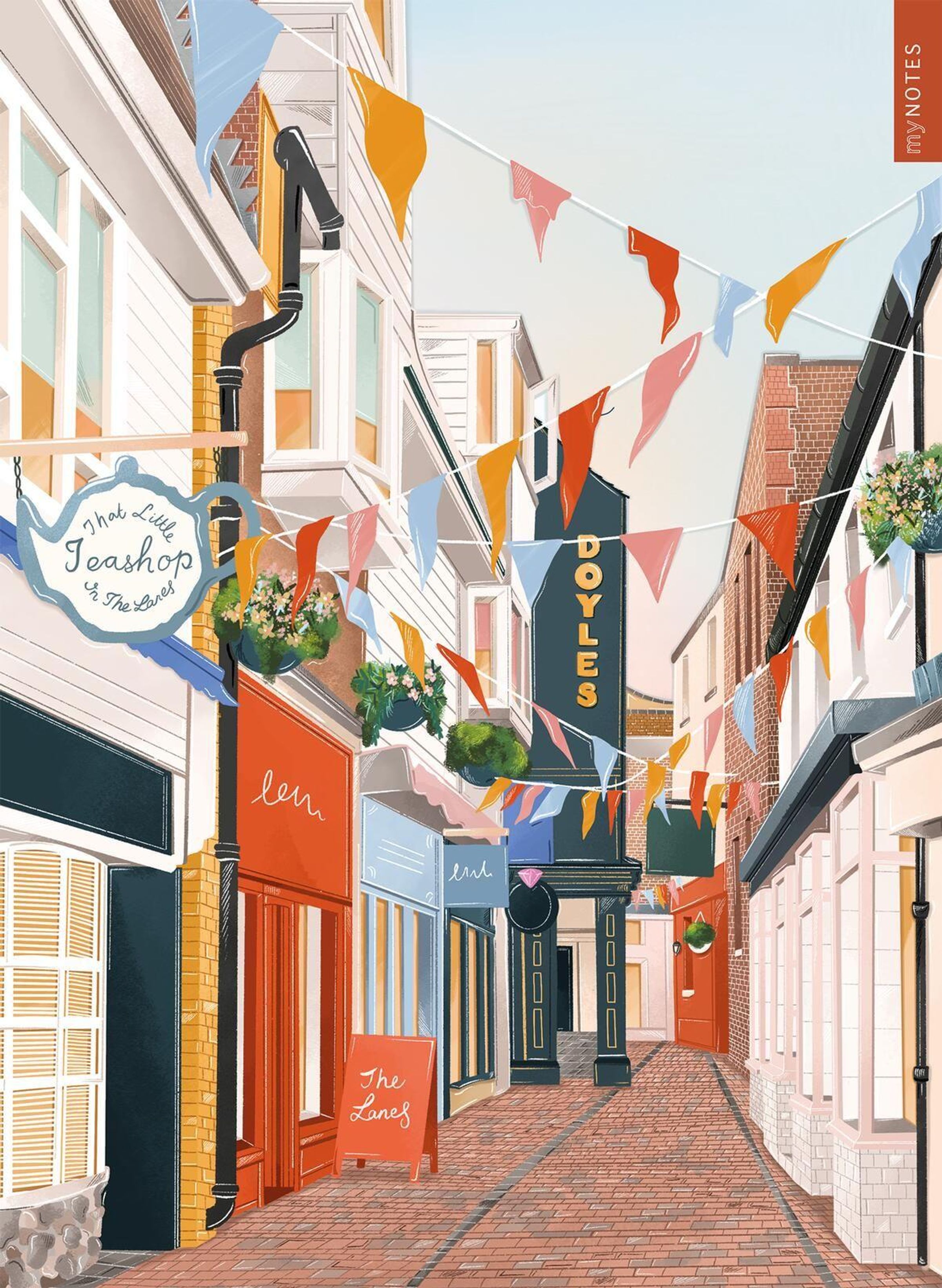 - **Zauberhaft gestaltet von Simply, Katy:**Die Illustration der angesagten britischen Künstlerin fängt die bunte, lebendige Atmosphäre des historischen Viertels "The Lanes" in Brighton ein und bringt englisches Lebensgefühl auf deinen Schreibtisch