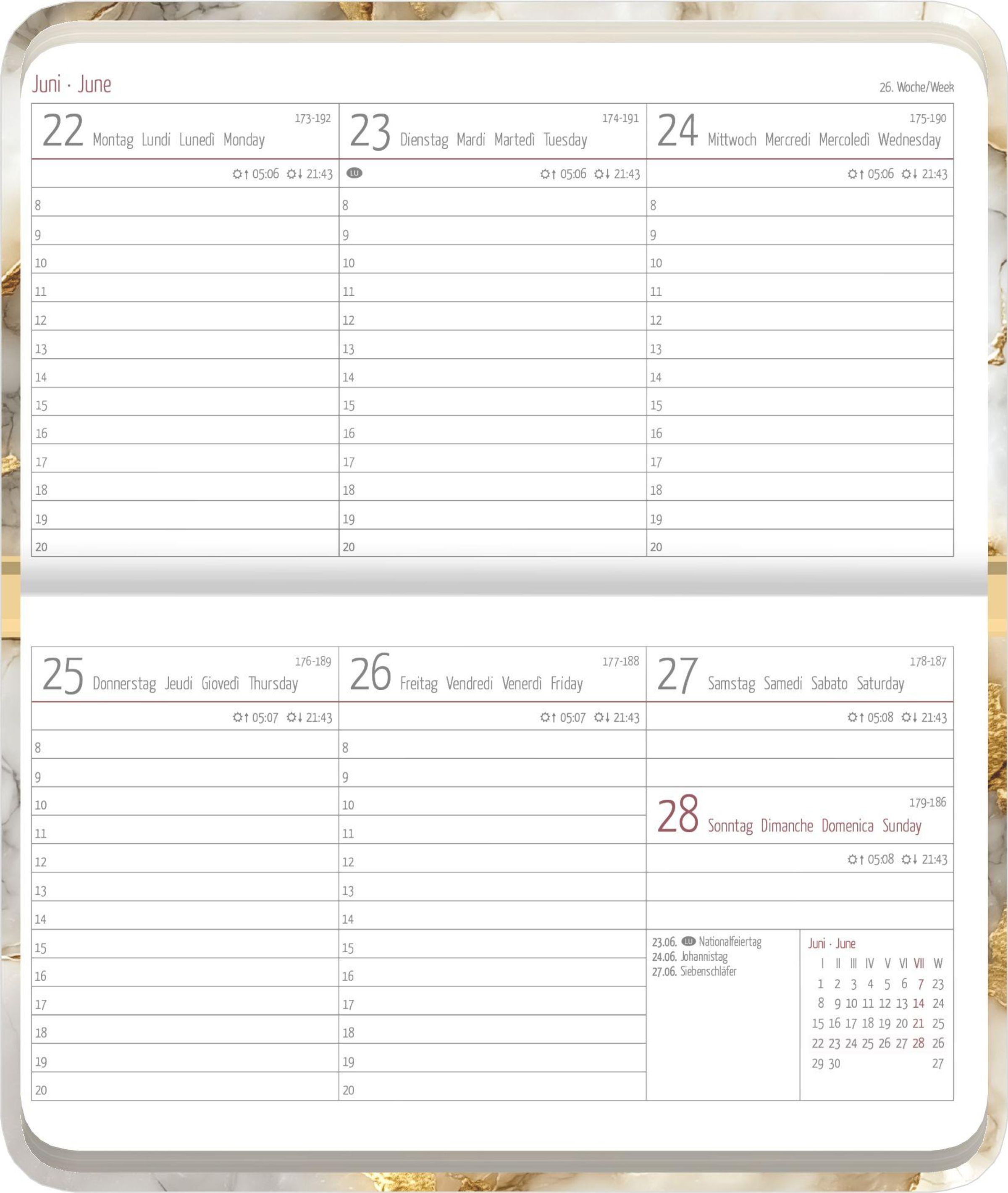 Organisieren Sie Ihren Alltag stilvoll -- mit dem „MyTimer Pad Marble 2027". Das elegante Marmordesign trifft auf ein praktisches Querformat und eine durchdachte Wochenübersicht -- perfekt für Schule, Beruf und unterwegs.