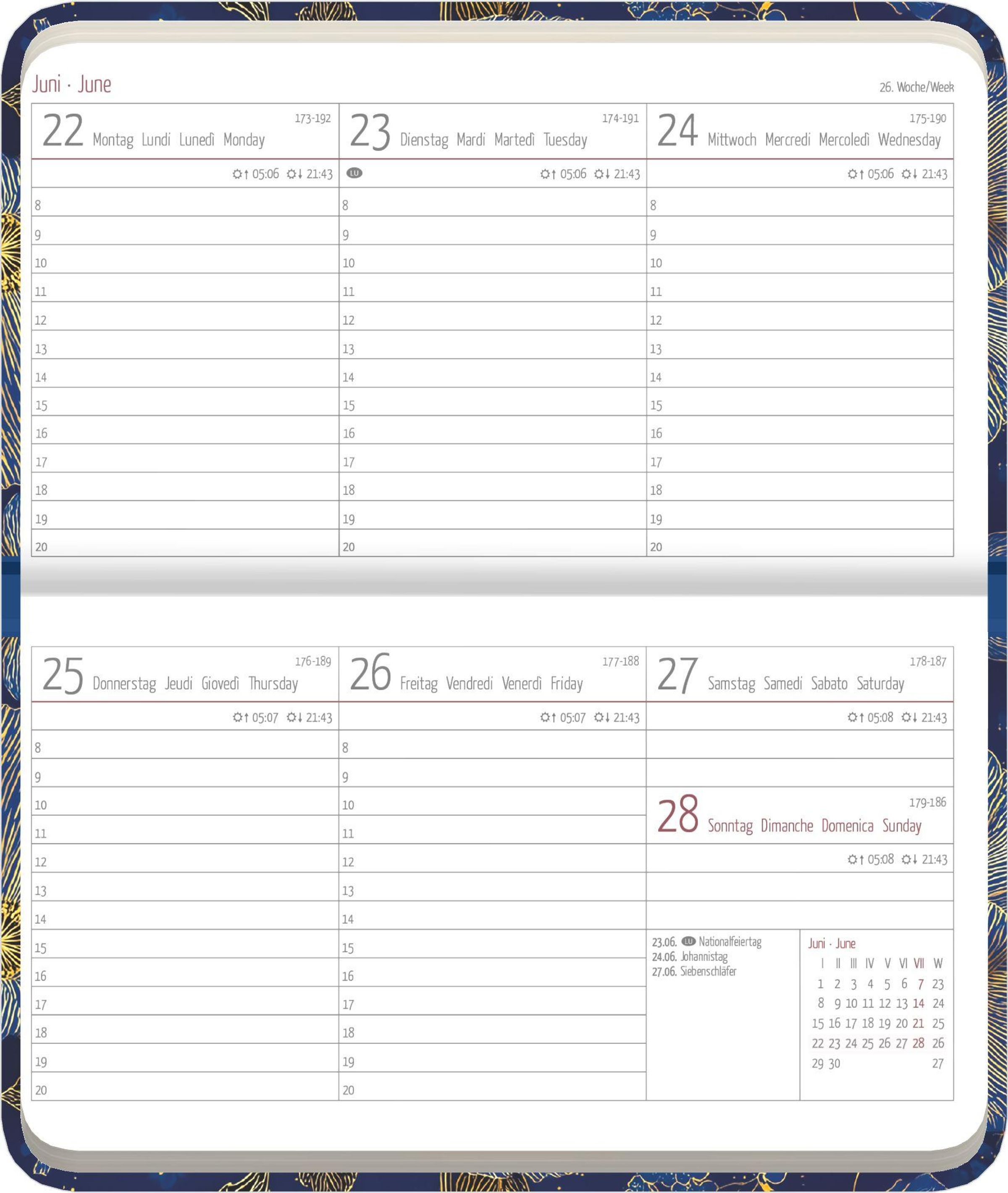 4-sprachiges Kalendarium: DE/FR/IT/GB mit Feiertagen (DE/AT/CH/FR/IT)