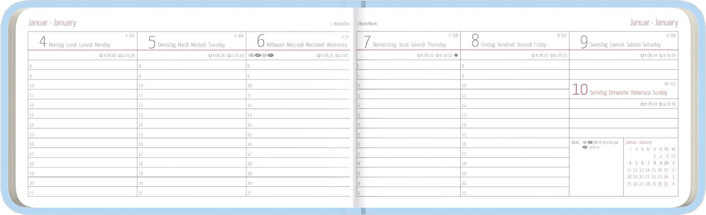 Mehrsprachig & informativ: 4-sprachiges Kalendarium (DE/FR/IT/GB) mit Feiertagen (DE/AT/CH/FR/IT)