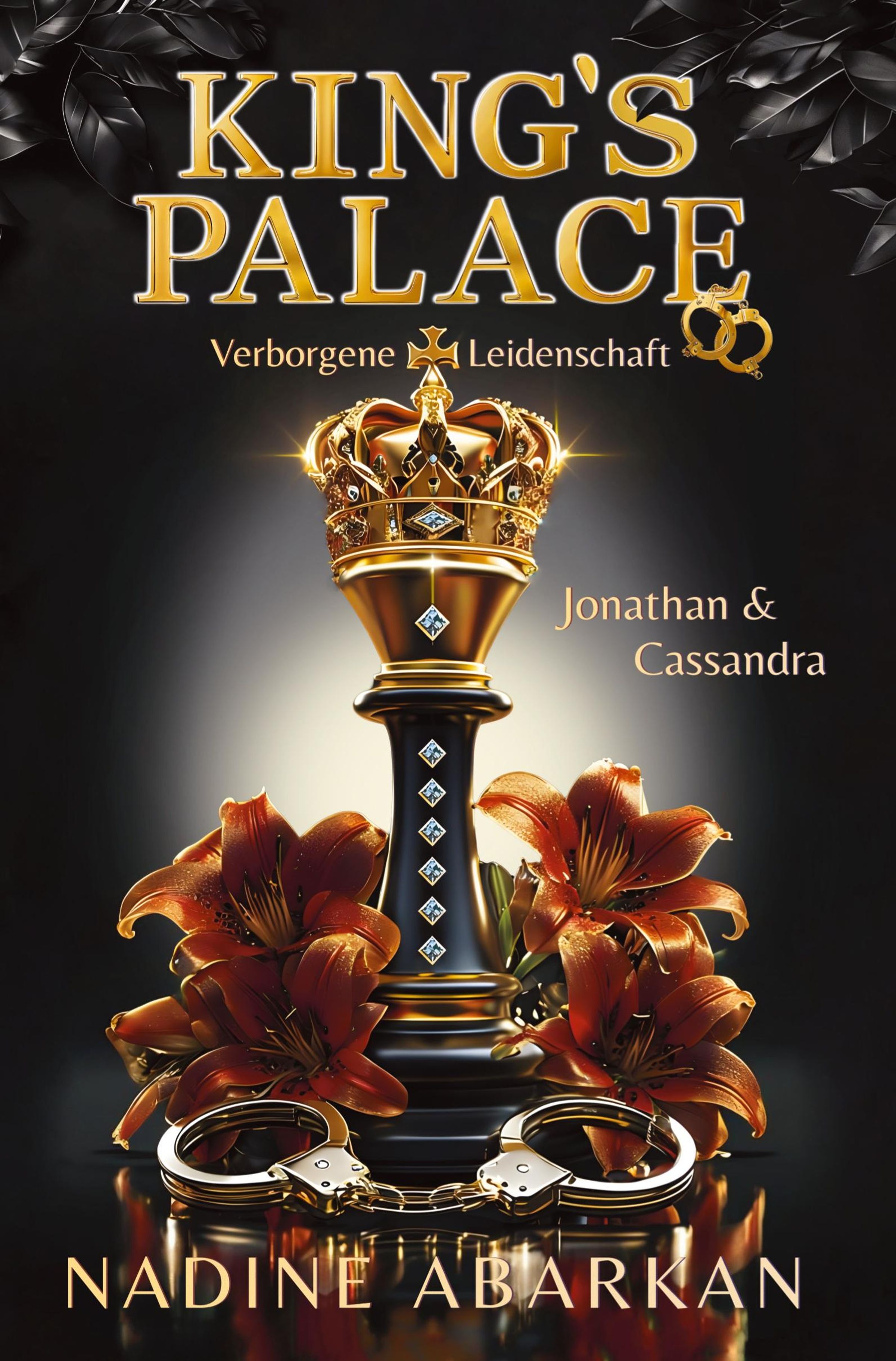 Text: "KING'S PALACE", "Verborgene Leidenschaft", "Jonathan & Cassandra", "NADINE ABARKAN". Eine Krone auf einem Sockel, Blumen, Handschellen., Buch