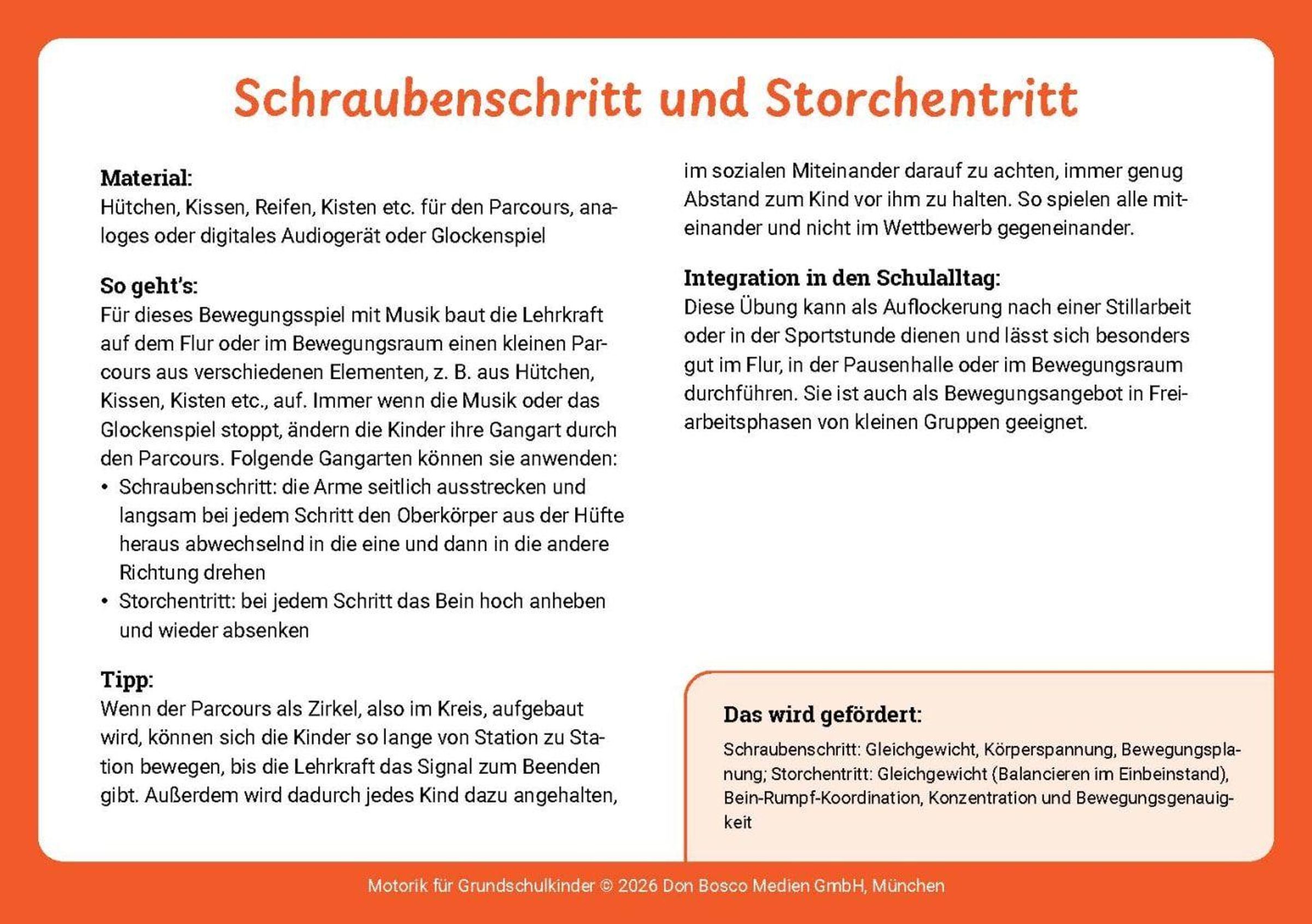 Kinder sitzen heute deutlich mehr als früher - ein Grund, warum sie oft mit unzureichenden motorischen Fähigkeiten eingeschult werden. Gerade in den ersten Schuljahren besteht die Chance, diese Fähigkeiten gezielt zu fördern und Entwicklungsschritte nachreifen zu lassen. Die Bildkarten unterstützen Lehrkräfte und Pädagog: innen dabei, kurze und effektive Bewegungspausen fest in den Unterrichtsalltag einzubauen. Ob rhythmische Schwungübungen oder kleine Geschicklichkeitsübungen: Schon wenige Minuten reichen, um die Konzentration zu steigern, das Lernen zu erleichtern und die Kinder ganzheitlich zu stärken.