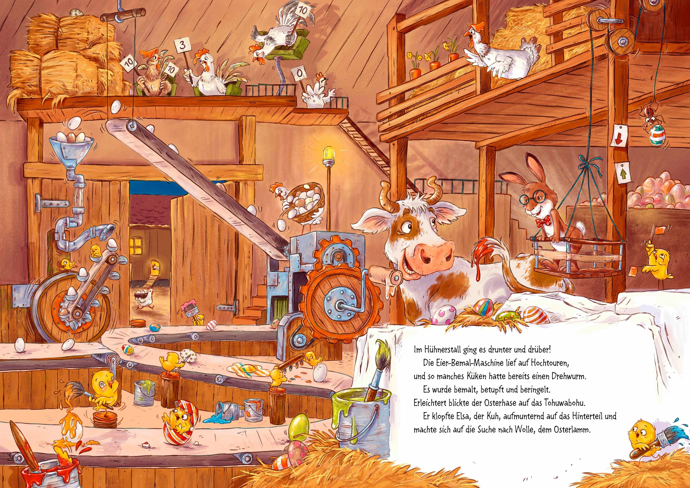 Der Osterhase hat's mal wieder vermasselt. Einen Tag vor Ostern fällt ihm auf, dass die Planung gehörig aus dem Ruder gelaufen ist. Es herrscht Chaos. Nur gut, dass er Freunde hat: Eitle Gockel, ein Haufen aufgeregter Hühner und ein in die Jahre gekommenes Osterlamm stehen ihm zur Seite, um das Unmögliche möglich zu machen. Als der Morgen dämmert, sieht es so aus, als würden sie es schaffen. Doch da kommt der Osterhase auf die dumme Idee, mitsamt seinen Eiern in einen Schornstein zu hüpfen ...