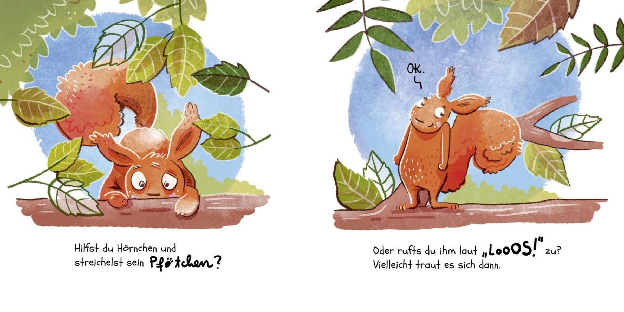 Die anderen Tierkinder spielen zusammen und haben Spaß. Hörnchen würde gern mitspielen, aber es traut sich nicht: Es kennt die Tierkinder ja gar nicht! Vor lauter Sorge versteckt es sich lieber... Hilfst du Hörnchen und machst ihm Mut?