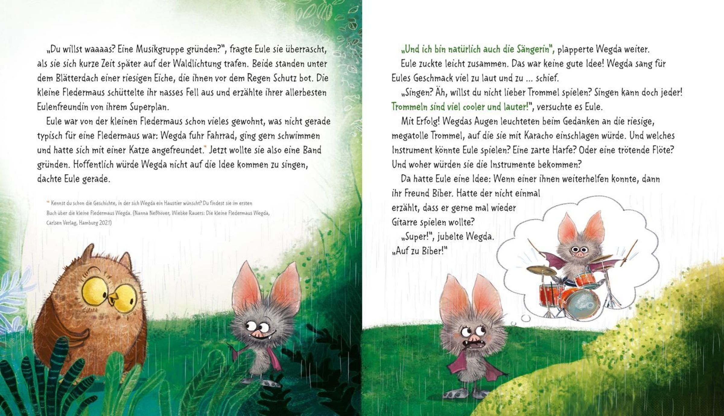 Die süßeste Fledermaus aller Zeiten ist zurück! In diesem wundervollen Vorlesebuch erlebt die kleine Fledermaus mit den großen Füßen mit ihren tierischen Freund*innen wieder jede Menge Alltagsabenteuer. Wegda macht Musik - und zwar am Schlagzeug, weil das soo schön laut ist! Sie wünscht sich einen Garten und sät Kresse aus - weil die soo schnell wächst und Wegda natürlich nicht die geduldigste Fledermaus der Welt ist. Außerdem macht sie einen Ausflug (mit Übernachtung, yippie!) und geht zum Kinder- ... äh, Waldtierturnen. Als Wegda traurig ist, wird sie getröstet. Und als Biber Hilfe braucht, ist Wegda für ihn da!