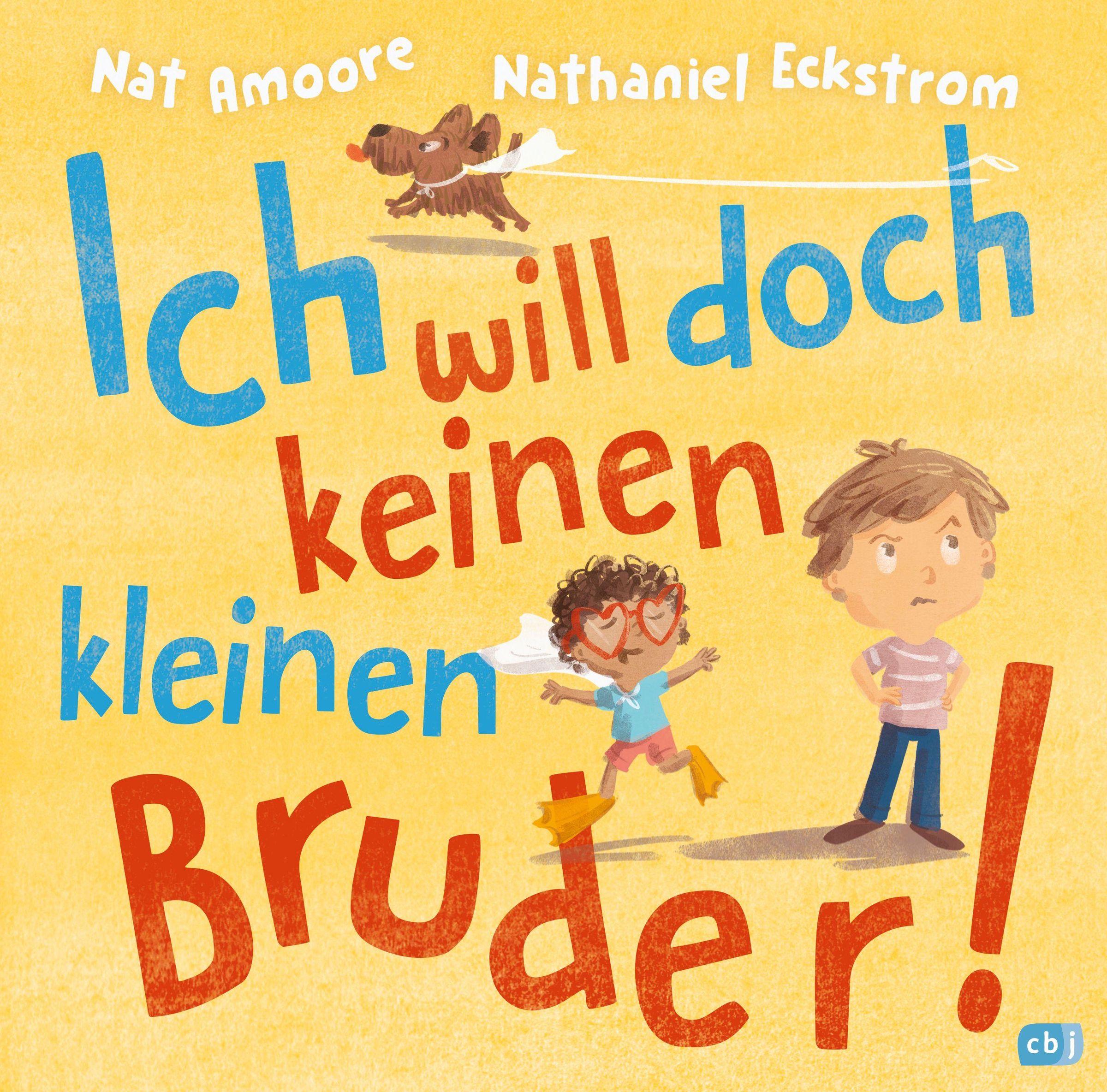 Text: "Ich will doch keinen kleinen Bruder!" Illustration: Zwei Kinder, eines mit Cape und großer Brille, daneben ein Hund., Buch