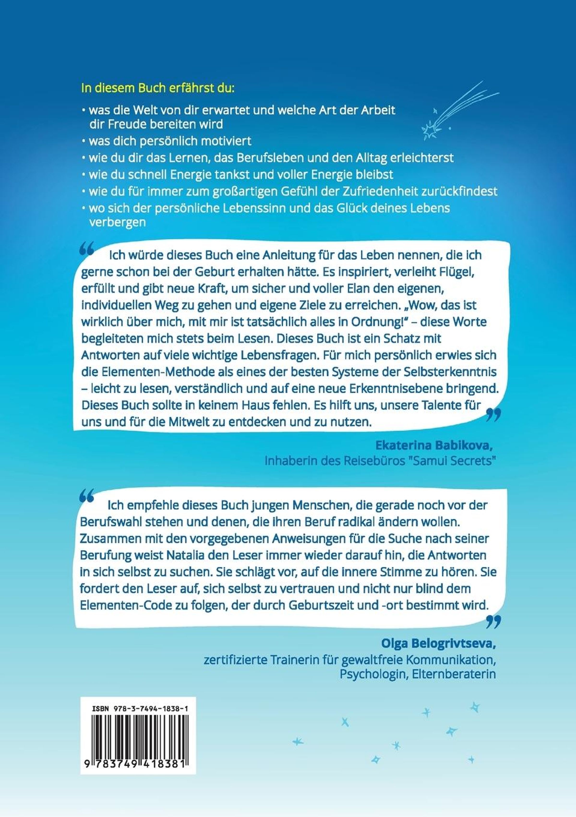 Die Buchautorin ¿ Coach, humane Personalvermittlerin und Online-Teacher ¿ entwickelte nach zehnjähriger Suche nach sich selbst diese effektive Methode, mit der jeder ganz einfach seine Berufung im Leben verstehen und finden kann. Dieses Buch spart dir etliche Lebensjahre für die Suche nach dir selbst und gibt dir die Chance, schon heute in deinem Lieblingsjob erfolgreich zu sein. Es erwarten dich anschauliche Tabellen, einfache Aufgaben und viele Beispiele aus dem echten Leben. Diese Methode würde sogar ein Kind verstehen. Einem Schulabgänger hilft sie bei der Berufsentscheidung und einem Erwachsenen hilft sie, das Leben zu verstehen und Erfüllung im Job zu finden.