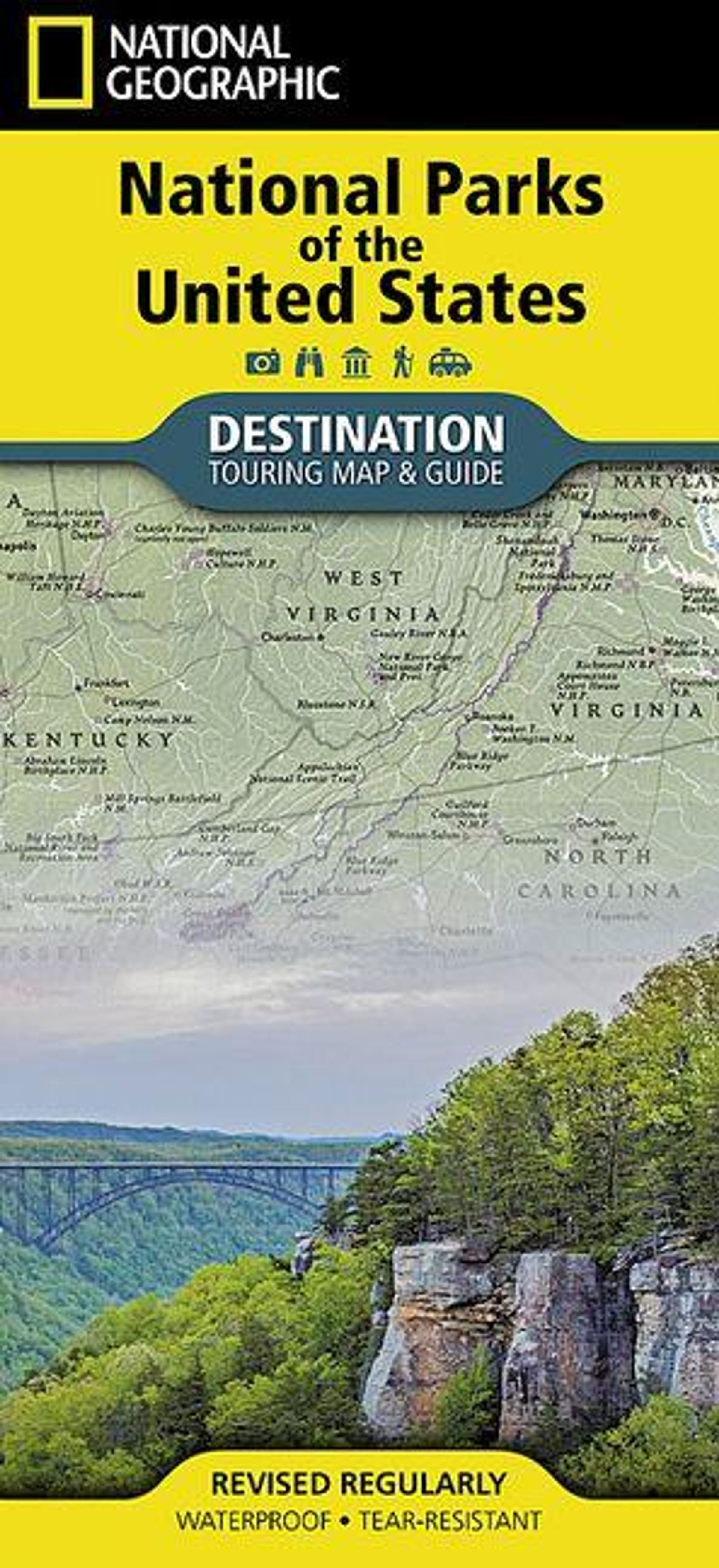 National Geographic's Destination Map of National Parks of the United States highlights the nearly 400 magnificent parks across America. The country is represented in subtle earth-tones with shaded mountain relief and intricately drawn river systems. Photos capture some of the diverse landscapes preserved and protected by the national park system. A list of all park service units, sorted by state, is also included to help you find the closest park, national monument, or national historic site.
