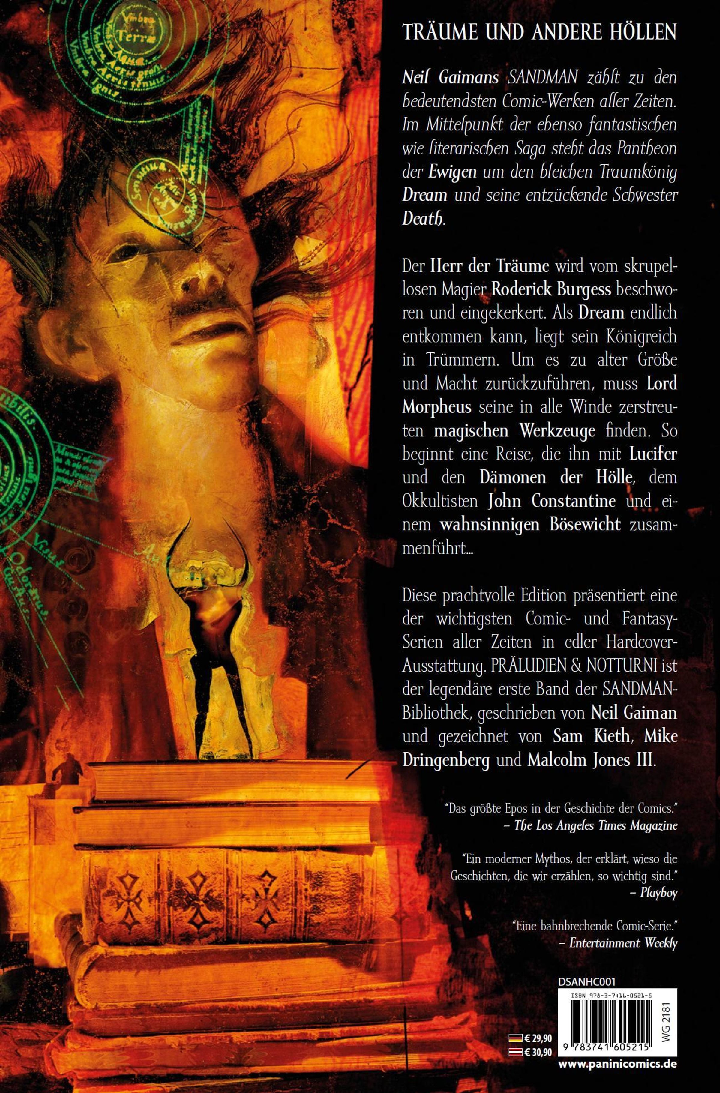 Der Herr der Träume wird vom skrupellosen Magier Roderick Burgess beschworen und eingekerkert. Als Dream endlich entkommen kann, liegt sein Königreich in Trümmern. Um es zu alter Größe und Macht zurückzuführen, muss Lord Morpheus seine in alle Winde zerstreuten magischen Werkzeuge finden. So beginnt eine Reise, die ihn mit Lucifer und den Dämonen der Hölle, dem Okkultisten John Constantine und einem wahnsinnigen Bösewicht zusammenführt... Diese prachtvolle Edition präsentiert eine der wichtigsten Comic- und Fantasy- Serien aller Zeiten in edler Hardcover- Ausstattung.