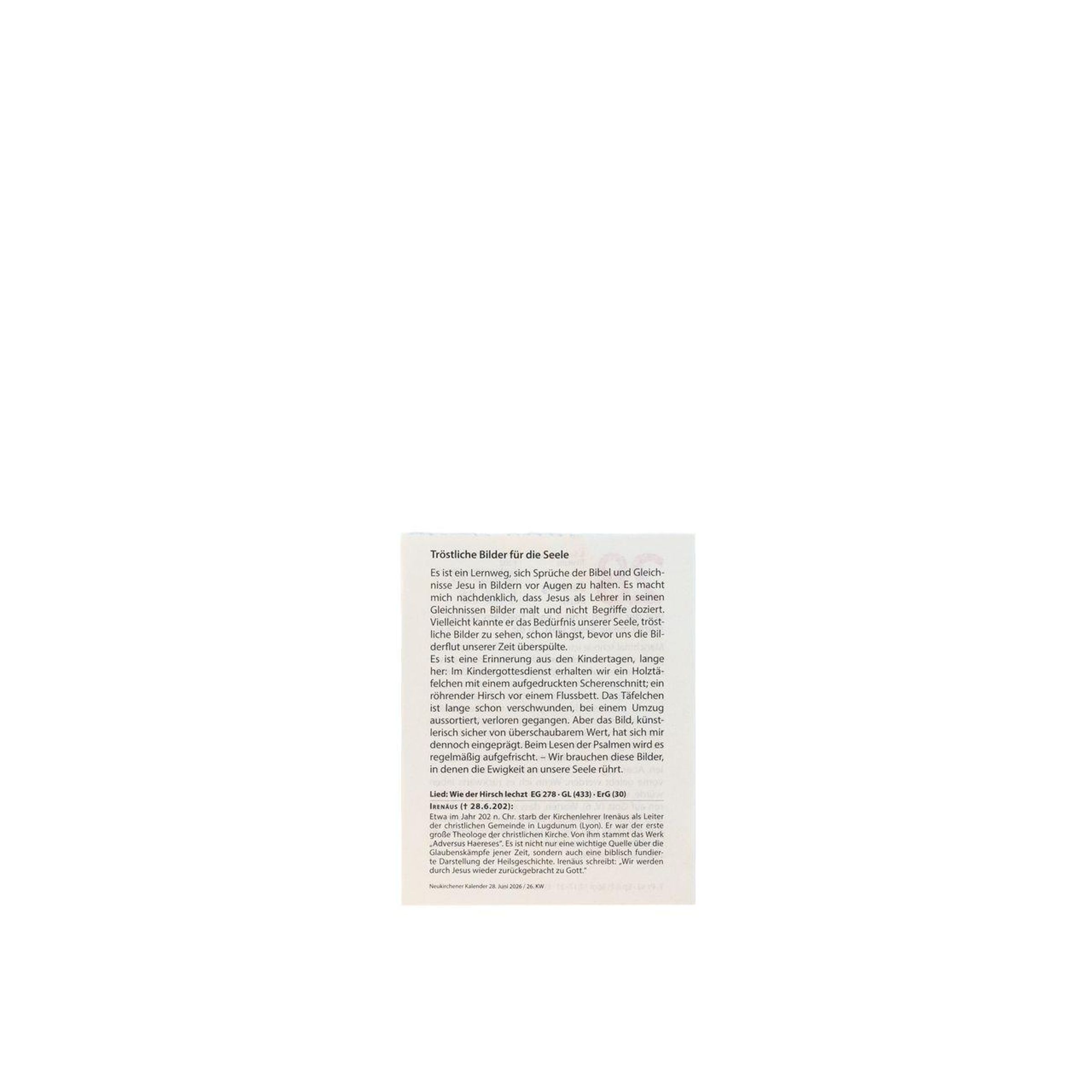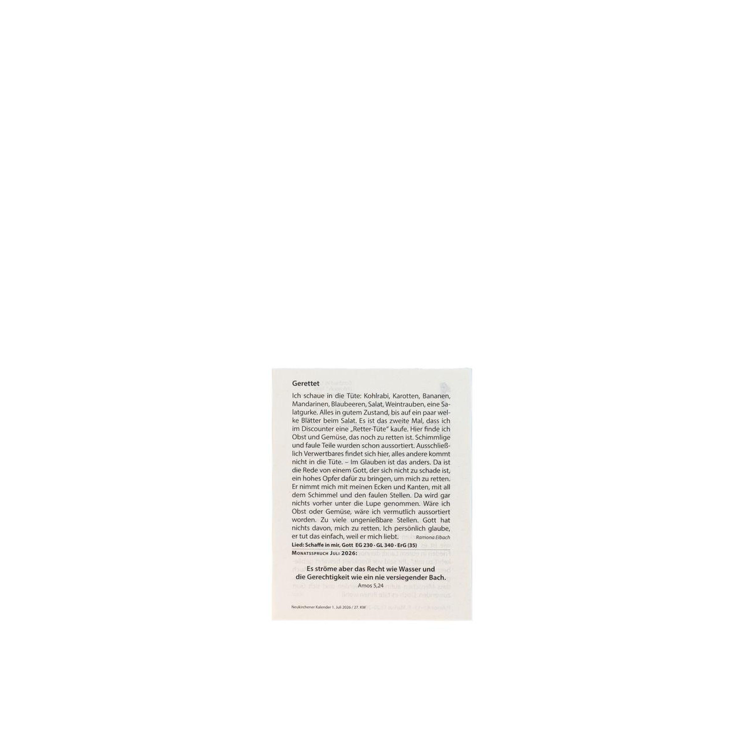 Der Neukirchener Kalender ist für viele Bibelleserinnen und -leser ein unverzichtbarer Impuls für den Tag! Über 200 Mitarbeitende aus fünf Ländern und verschiedenen christlichen Kirchen sorgen dafür, dass dieser traditionsreiche Andachts- und Bibellesekalender für einen offenen und lebensnahen Glauben steht. Besonders machen ihn seine beiden täglichen Texte: Im ersten wird der Bibeltext des Ökumenischen Bibelleseplans erschlossen und im zweiten mit einer alltagsnahen Erzählung, einem Impuls oder einem Gebet veranschaulicht. Ergänzt werden die Texte mit Liedvorschlägen, Jahrestagen besonderer Persönlichkeiten, den beliebten Buchtipps, und den Monatssprüchen.