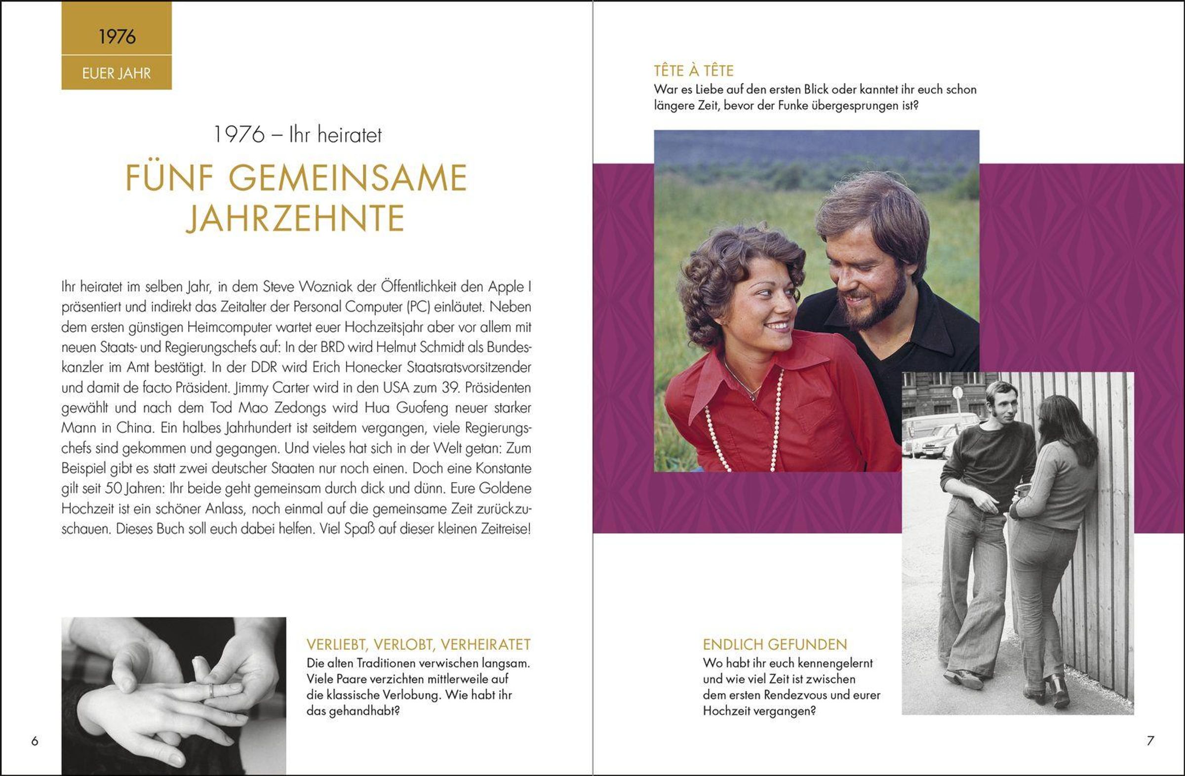 Das Jahrgangsbuch für Ehepaare, die 1976 geheiratet haben, ist eine wunderbare Zeitreise durch die letzten 50 Jahre: Authentische Fotos und spannende Zahlen und Fakten führen durch die Ära-Highlights aus Gesellschaft, Kultur, Kulinarik und Lifestyle. So können die Beschenkten zu ihrer Goldenen Hochzeit in Erinnerungen schwelgen und die Geschichte ihrer Liebe neu aufleben lassen.