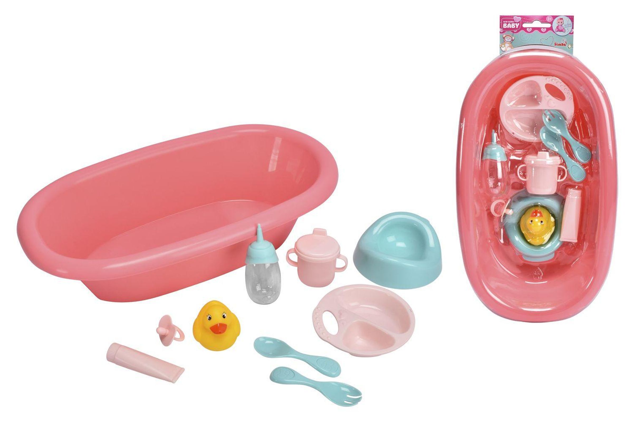 In der 39cm langen Wanne kann das Puppen-Baby gebadet werden. Kinder können dabei in die Rolle der Eltern schlüpfen und ihre Puppe baden und umsorgen als wäre es ein echtes Baby. Mit viel Zubehör wie Badeente, Töpfchen, Fläschchen, Trinkbecher, Teller, Löffel und Schnuller. Für Kinder ab 3 Jahren geeignet.