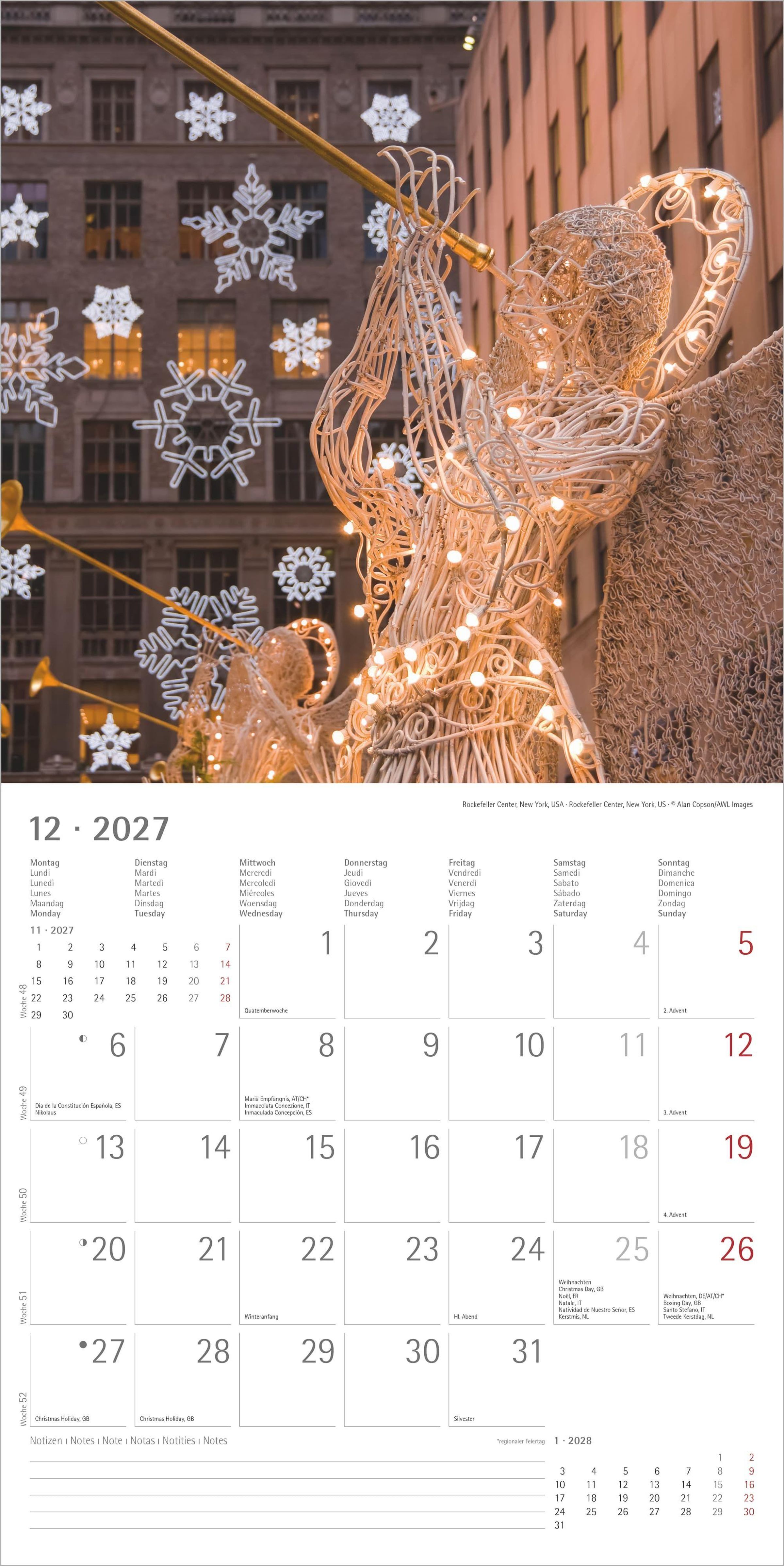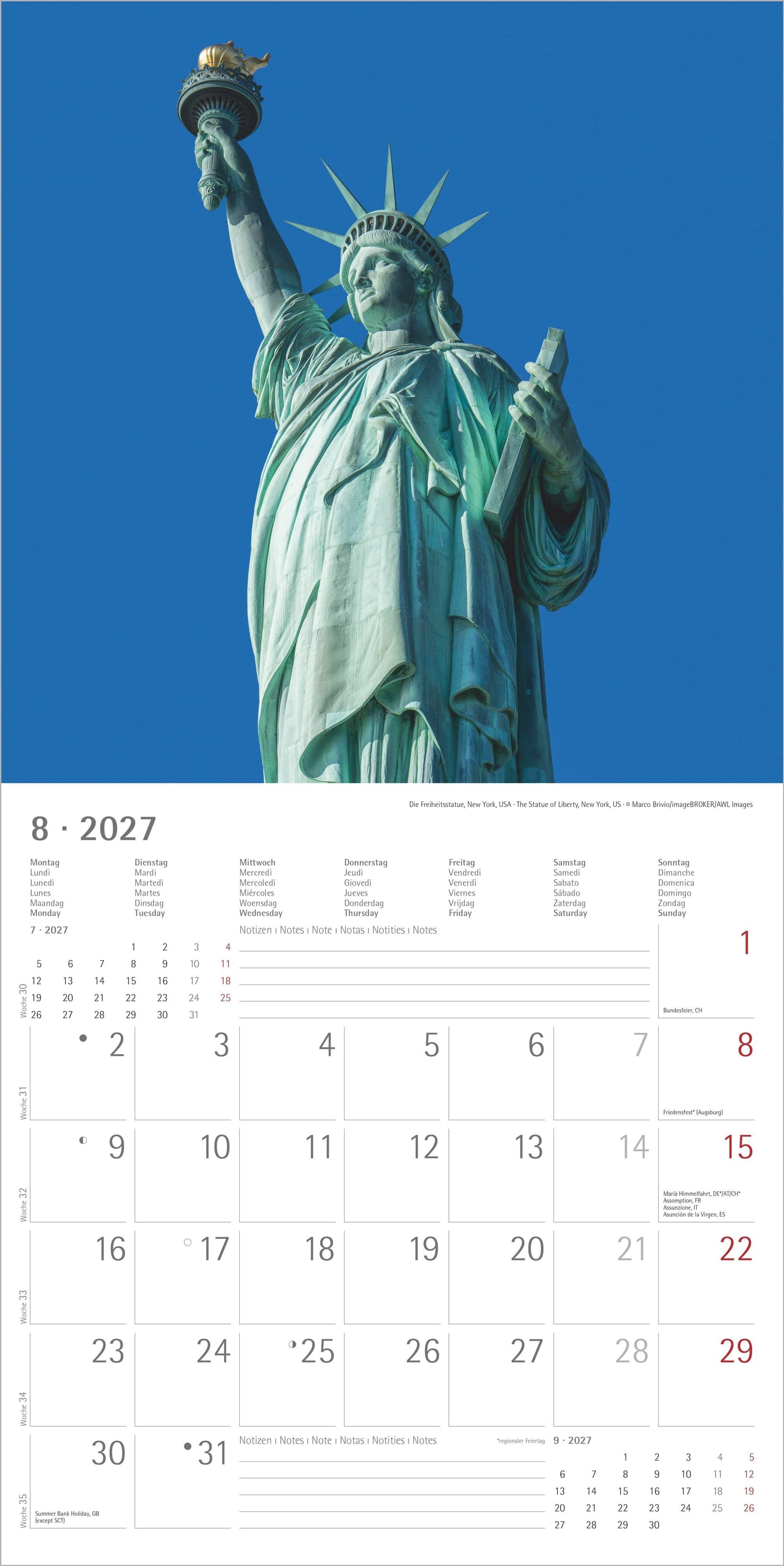 Text: "NEW YORK 2024", "PLUS BUCKET LIST". Eine urbane Skyline bei Sonnenuntergang mit beleuchteten Wolkenkratzern., Kalender
