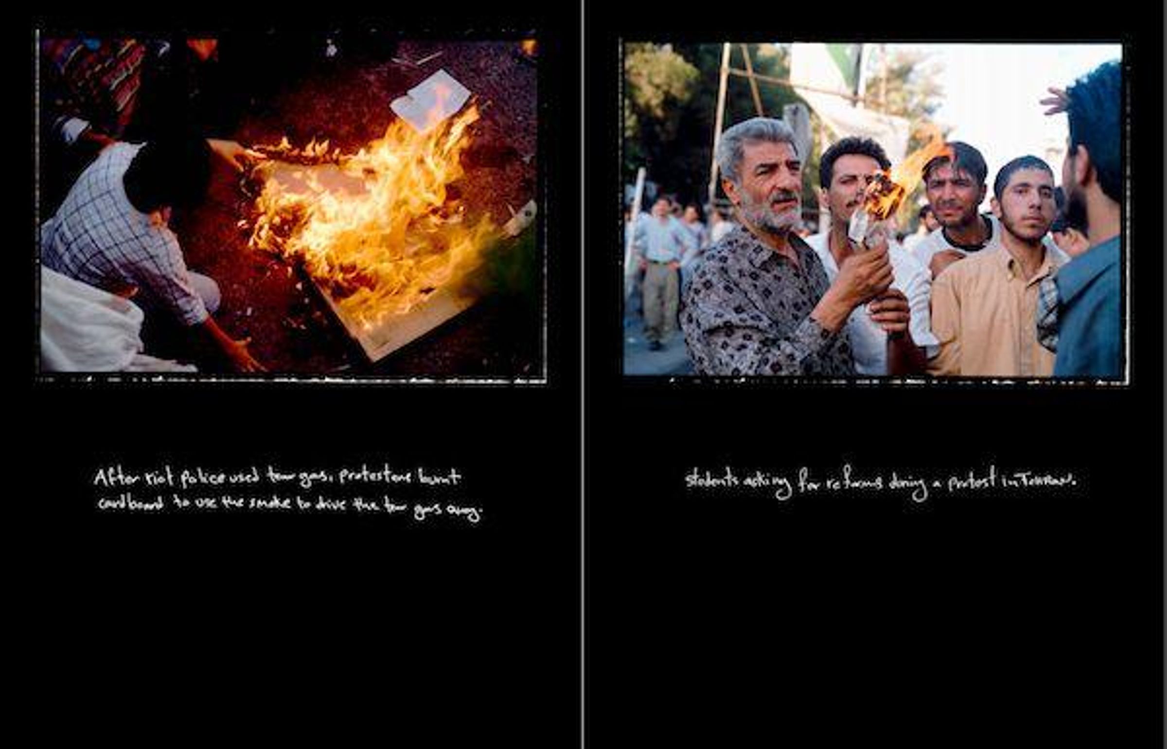 'Bei der Betrachtung dieser Schandflecke vor dem Hintergrund neuer schrecklicher Ereignisse zeigt sich eine klare Entwicklung von der Hoffnung und den Träumen der Jugend zur Enttäuschung über die Realität und zur Schlussfolgerung, dass es im Leben nur eine echte Wahl gibt. Sich von der Dunkelheit anziehen zu lassen oder sich dafür zu entscheiden, die Dunkelheit zu bekämpfen und sich dem Licht zuzuwenden.' (Newsha Tavakolian)