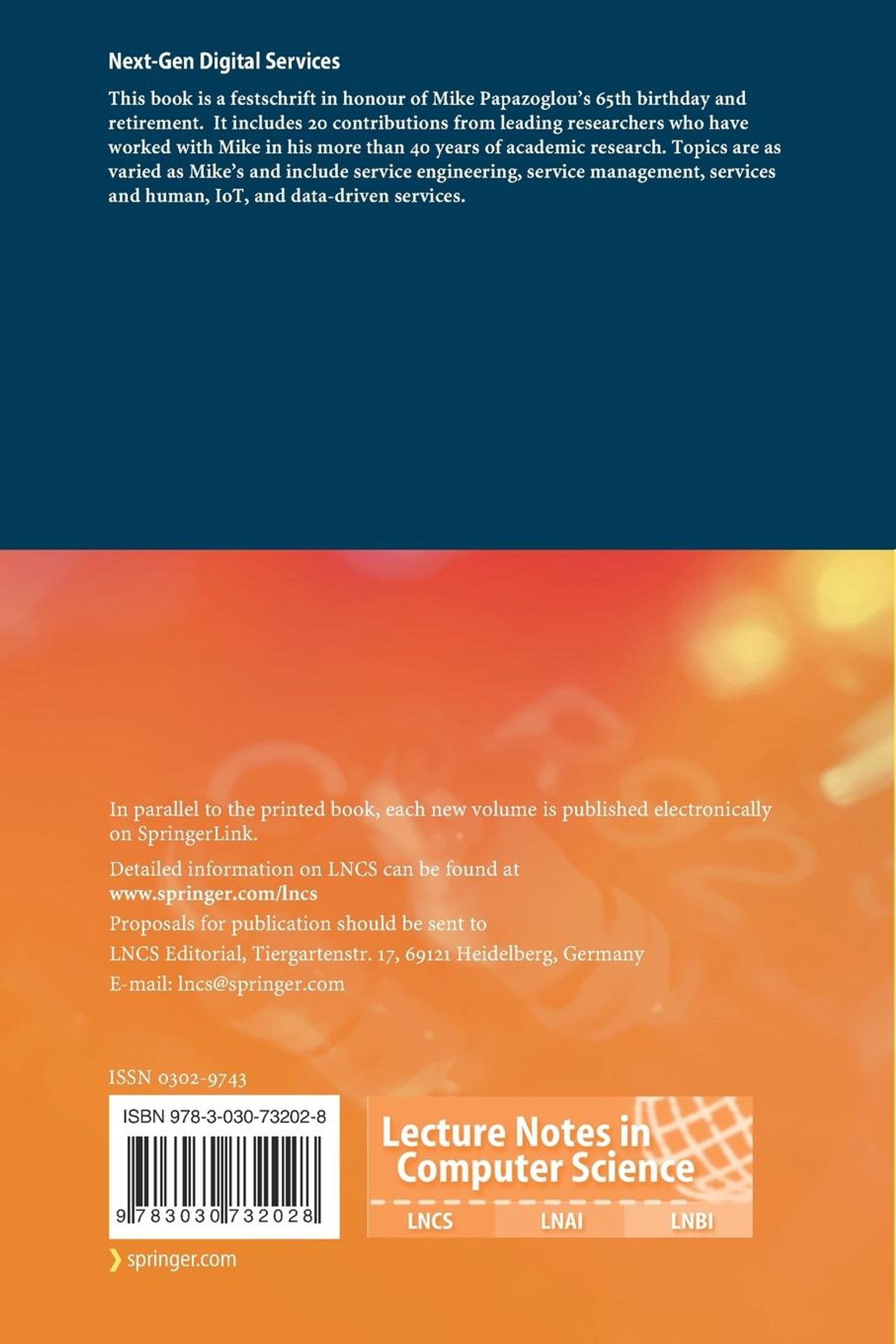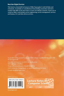 This book is a festschrift in honour of Mike Papazogloüs 65th birthday and retirement. It includes 20 contributions from leading researchers who have worked with Mike in his more than 40 years of academic research. Topics are as varied as Mikes and include service engineering, service management, services and human, IoT, and data-driven services.
