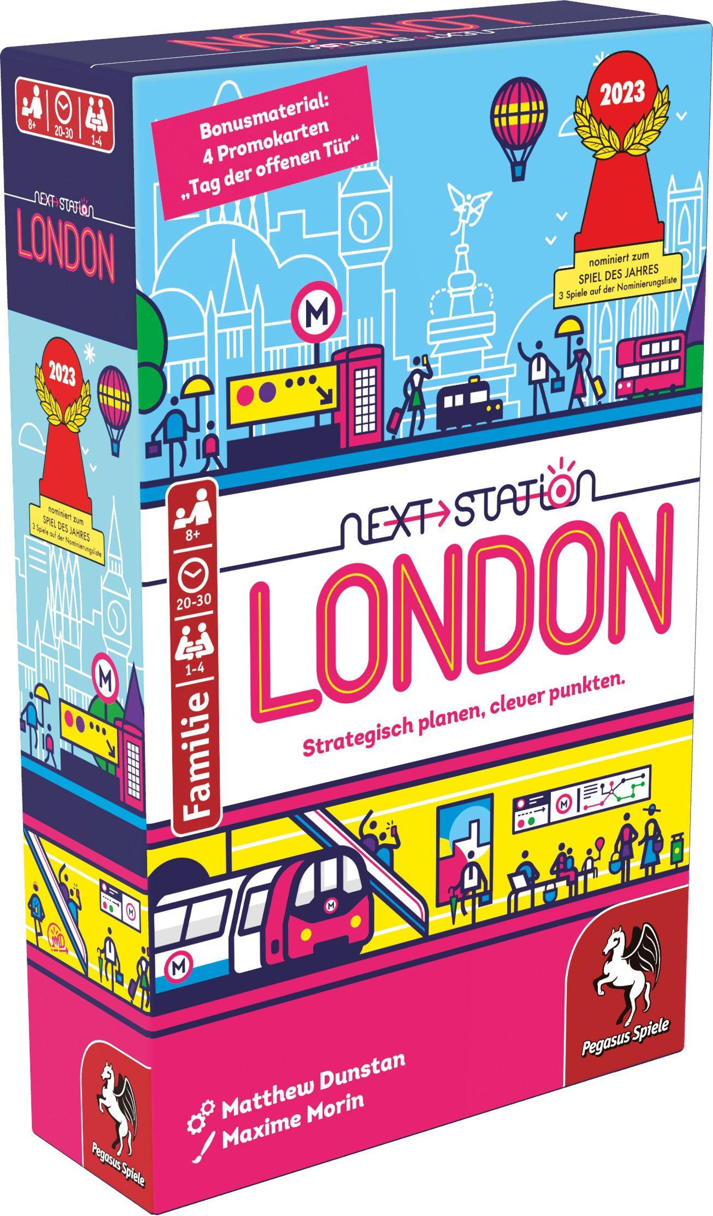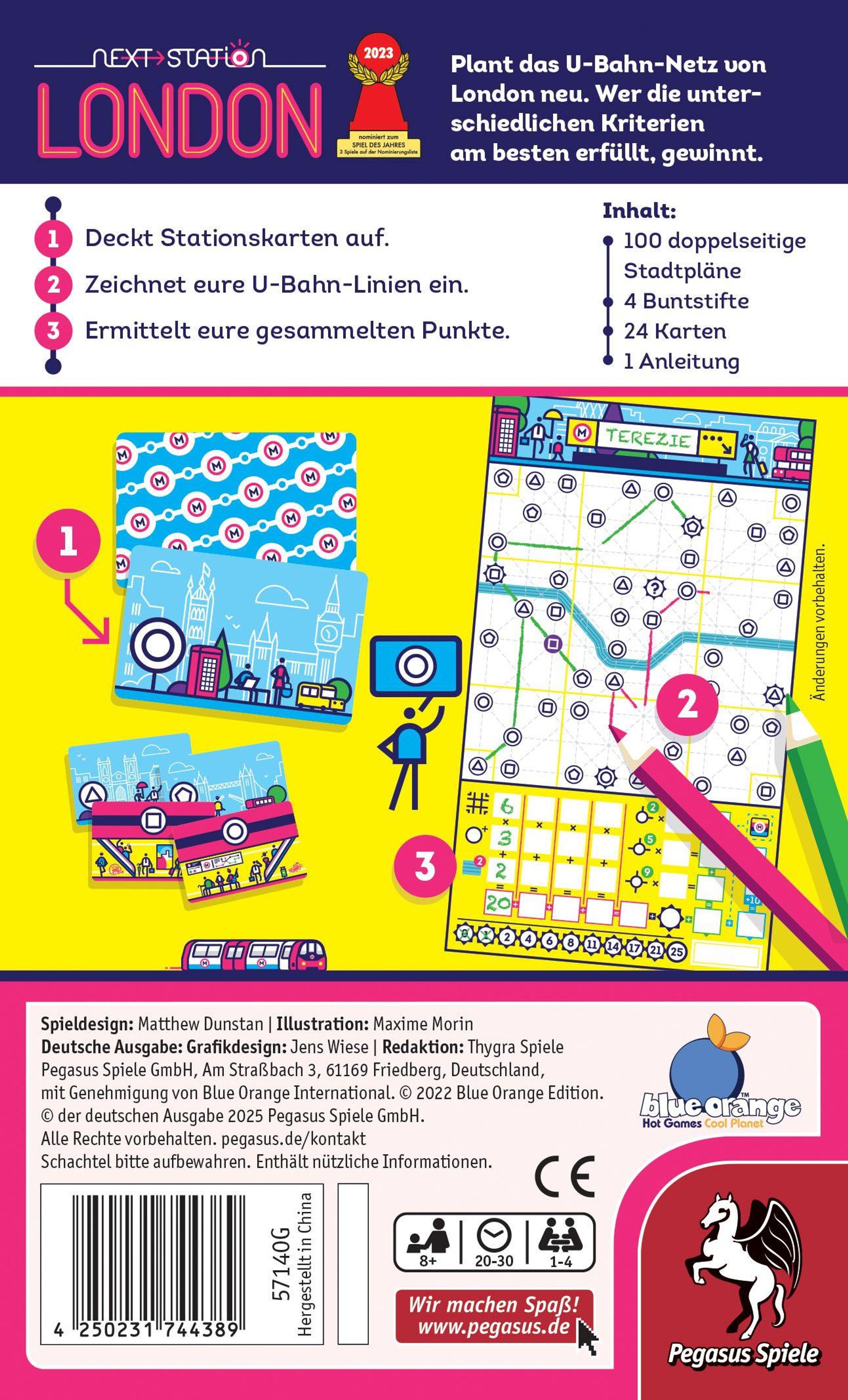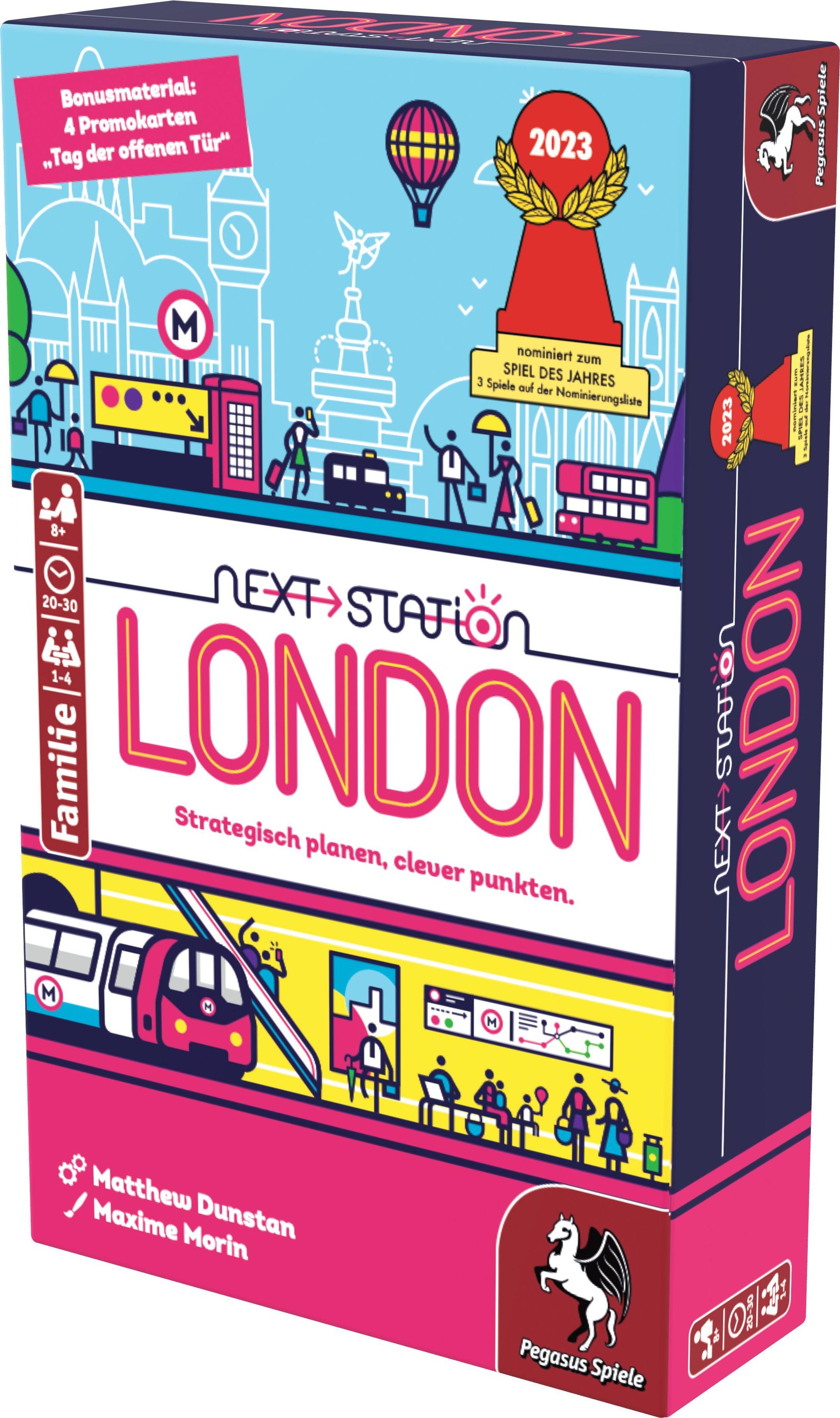 Please mind the gap: In Next Station London übernehmen die Spielenden die Aufgabe, das U-Bahn-Netz der Stadt neu zu gestalten. Dabei sollen möglichst viele Stadtbezirke durch zahlreiche Haltestellen erschlossen, miteinander verbunden und durchdachte Umsteigemöglichkeiten geschaffen werden. Auch wichtige Attraktionen der Stadt sollten dabei nicht vergessen werden und eigene Haltestellen erhalten. Wenn dann noch die Themse gekreuzt wird, ist die Stadtverwaltung besonders glücklich. Das neue Netzwerk für die "Tube" ist nach vier Durchgängen mit je fünf bis zehn Runden fertig und stellt sich dann der Punktewertung. Für anspruchsvollere Partien des Flip-&-Write-Spiels stehen verschiedene optionale Module zur Verfügung: "Farbeffekte", "Zielkarten" und "Tag der offenen Tür". Das Modul "Farbeffekte" ist mit den unabhängigen Spielen Next Station Tokyo und Next Station Paris kombinierbar.