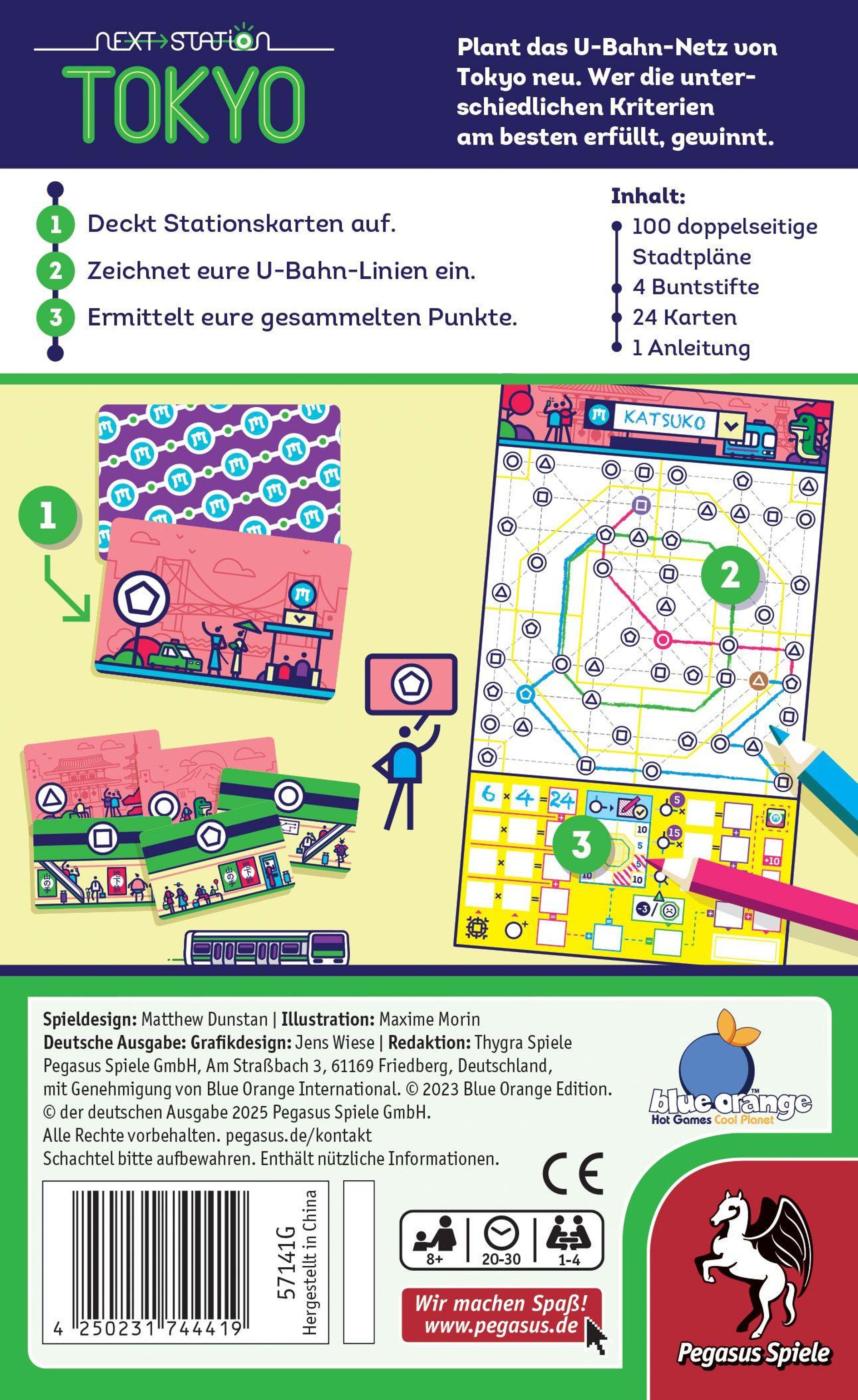 Bei Next Station Tokyo geht es darum, ein neues U-Bahn-Netz für die Stadt zu entwerfen. Dabei versuchen die Spielenden möglichst viele Stadtbezirke zu verbinden und auch der Stadtbezirk mit den meisten Haltestellen bringt bei dem Flip-&-Write-Spiel Punkte ein. Besonders kniffelig ist in diesem Teil der Next Station Reihe die bereits eingezeichnete Yamanote-Linie, die auch im echten Tokyo rund um den Zentralbezirk verläuft, da sie genauso wie die anderen Linien nicht gekreuzt werden darf. Der Zentralbezirk muss daher mithilfe von nur acht Umsteigestationen mit den touristischen Randbezirken verknüpft werden. Nach vier Durchgängen mit jeweils fünf bis zehn Runden ist das neue U-Bahn-Netzwerk fertig gestaltet und wird anschließend von der Stadtverwaltung beurteilt. Für anspruchsvollere Partien stehen verschiedene optionale Module zur Verfügung: "Stationseffekte" und "Zielkarten". Das Modul "Stationseffekte" ist mit den unabhängigen Spielen Next Station London und Next Station Paris kombinierbar.