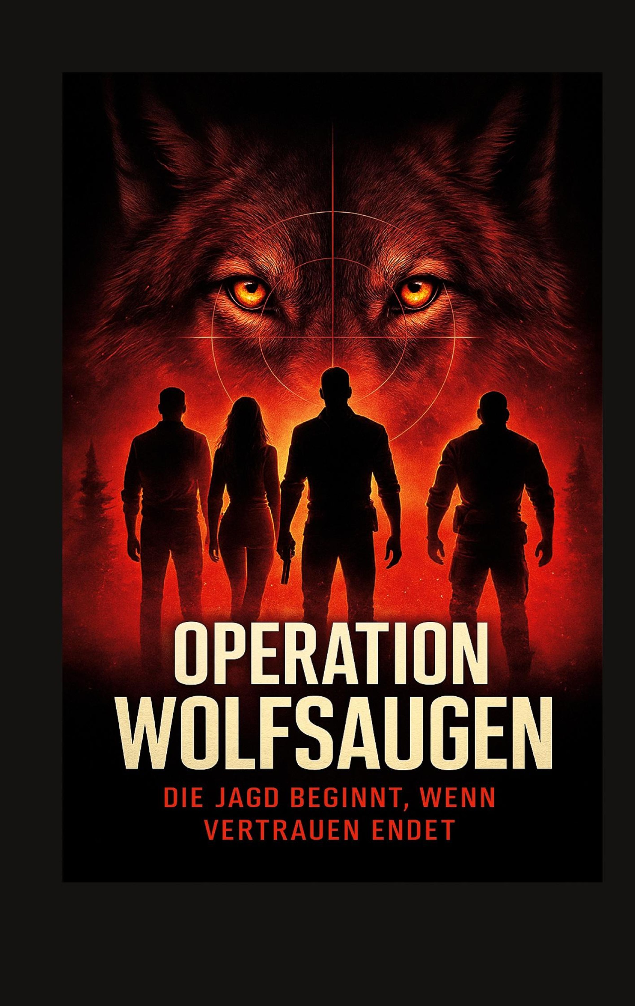„OPERATION WOLFSAUGEN. Die Jagd beginnt, wenn Vertrauen endet.“ Vier Personen stehen vor einem riesigen Wolfsgesicht., Buch