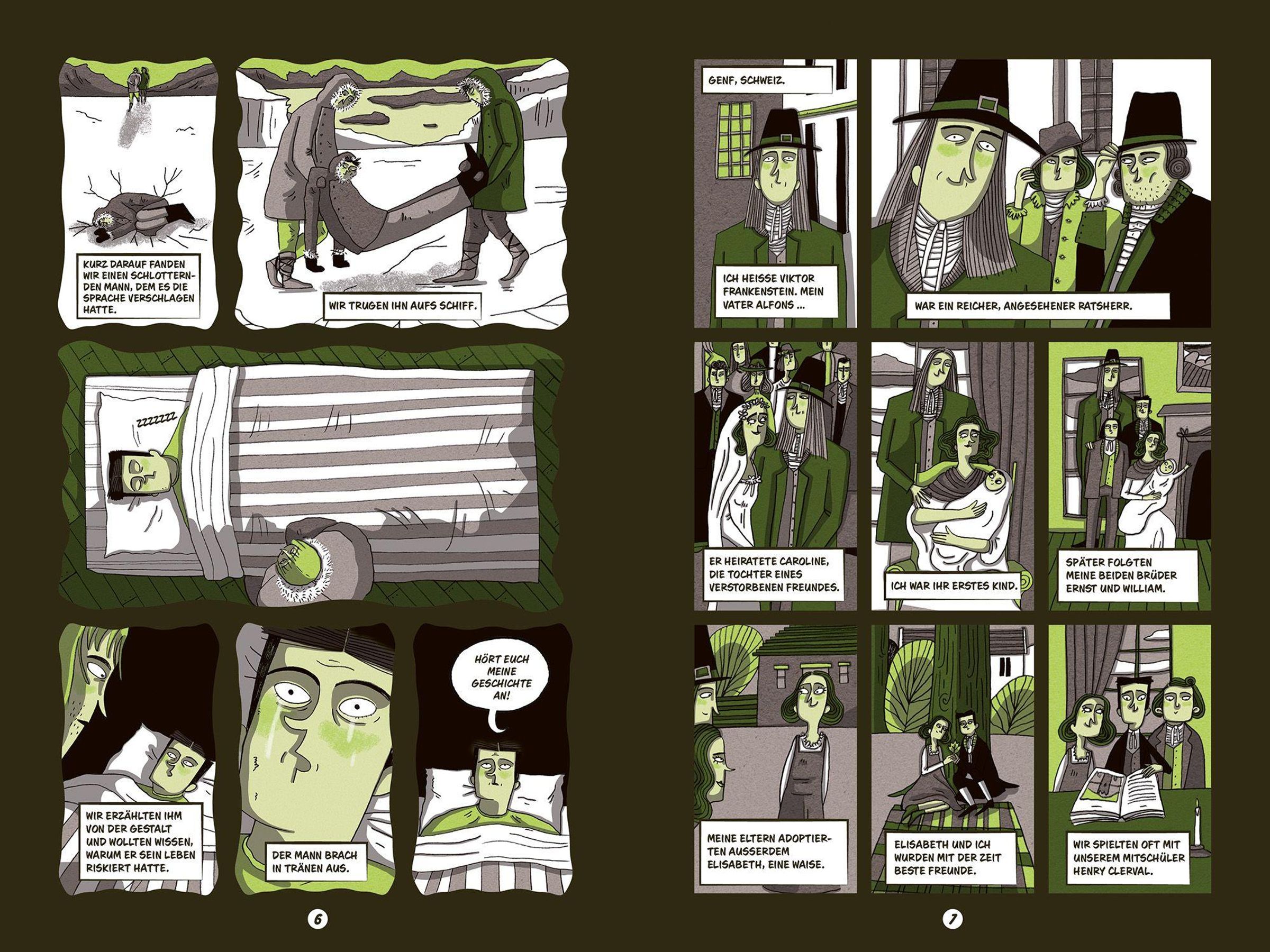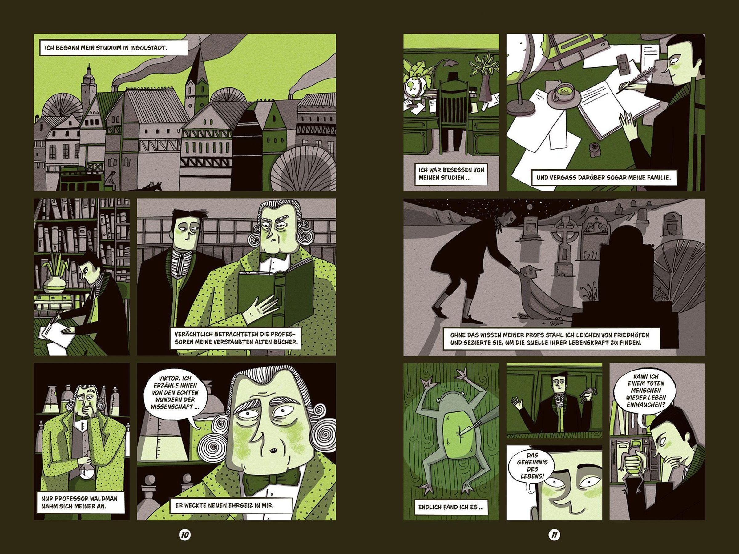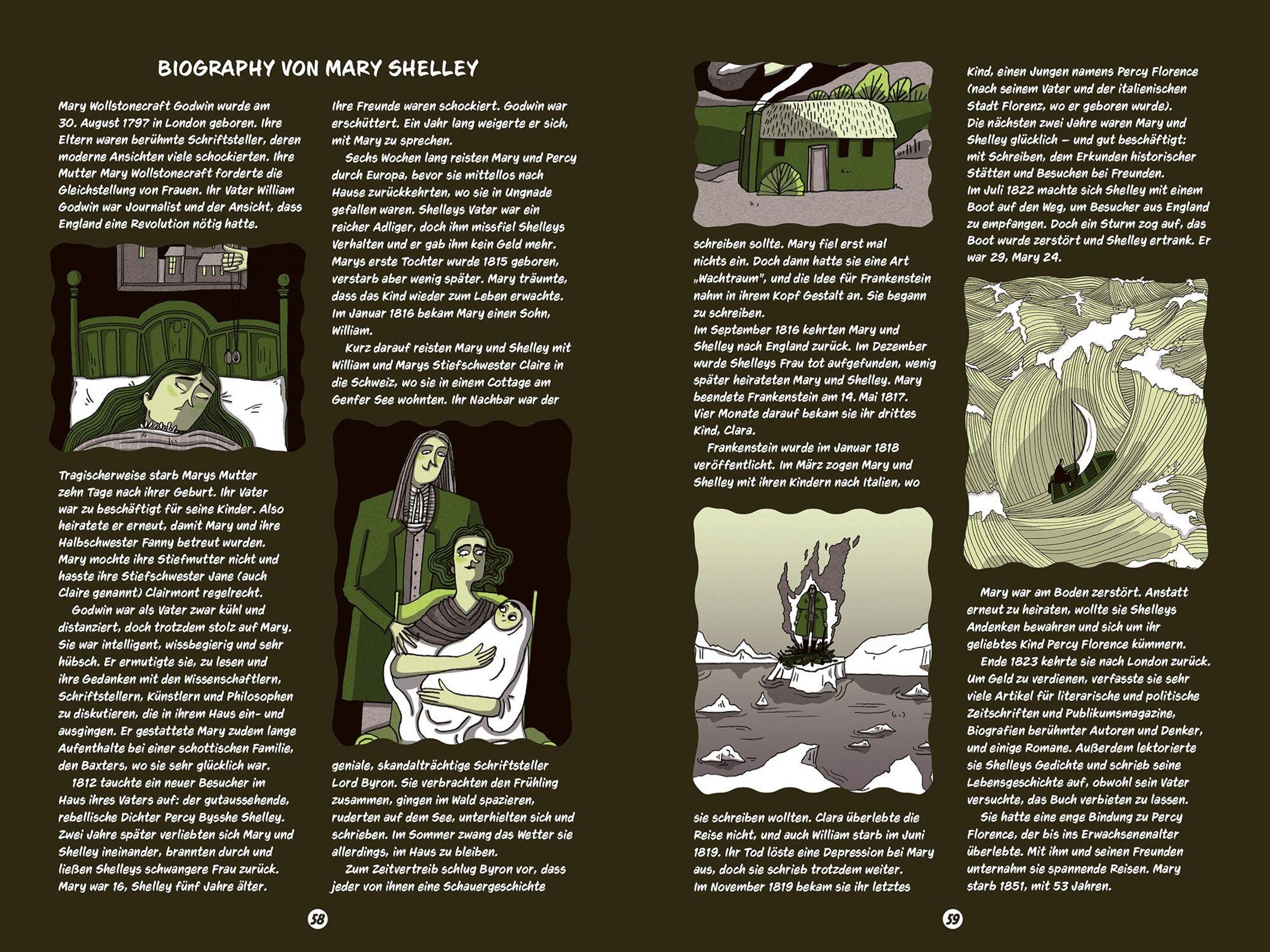 Victor Frankenstein träumt davon, das Geheimnis des Lebens zu entschlüsseln - und erschafft ein Wesen, das stärker ist als jeder Mensch. Doch als er seine Kreatur voller Entsetzen verstößt, beginnt eine verhängnisvolle Kette aus Einsamkeit, Wut und Rache, die bis ins ewige Eis führt. Diese moderne Graphic-Novel-Adaption von Mary Shelleys Klassiker erzählt die berühmte Geschichte atmosphärisch und kindgerecht neu. Ausdrucksstarke, stimmungsvolle Illustrationen und klar strukturierte Bildfolgen mit Sprechblasen machen den Stoff auch für jüngere Leserinnen und Leser zugänglich. Ein informativer Anhang mit Hintergründen zu Autorin, Entstehungszeit und zentralen Themen rundet diese packende Einführung in den literarischen Horror ab.