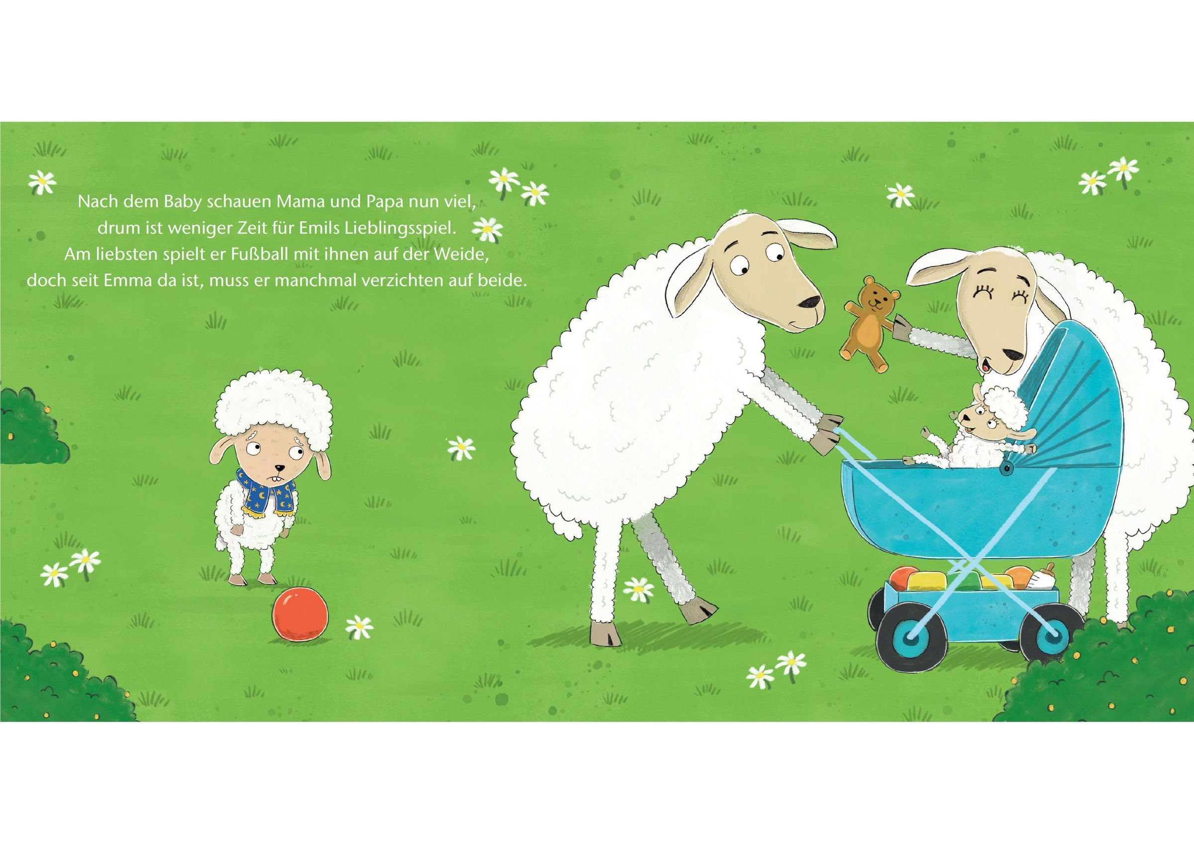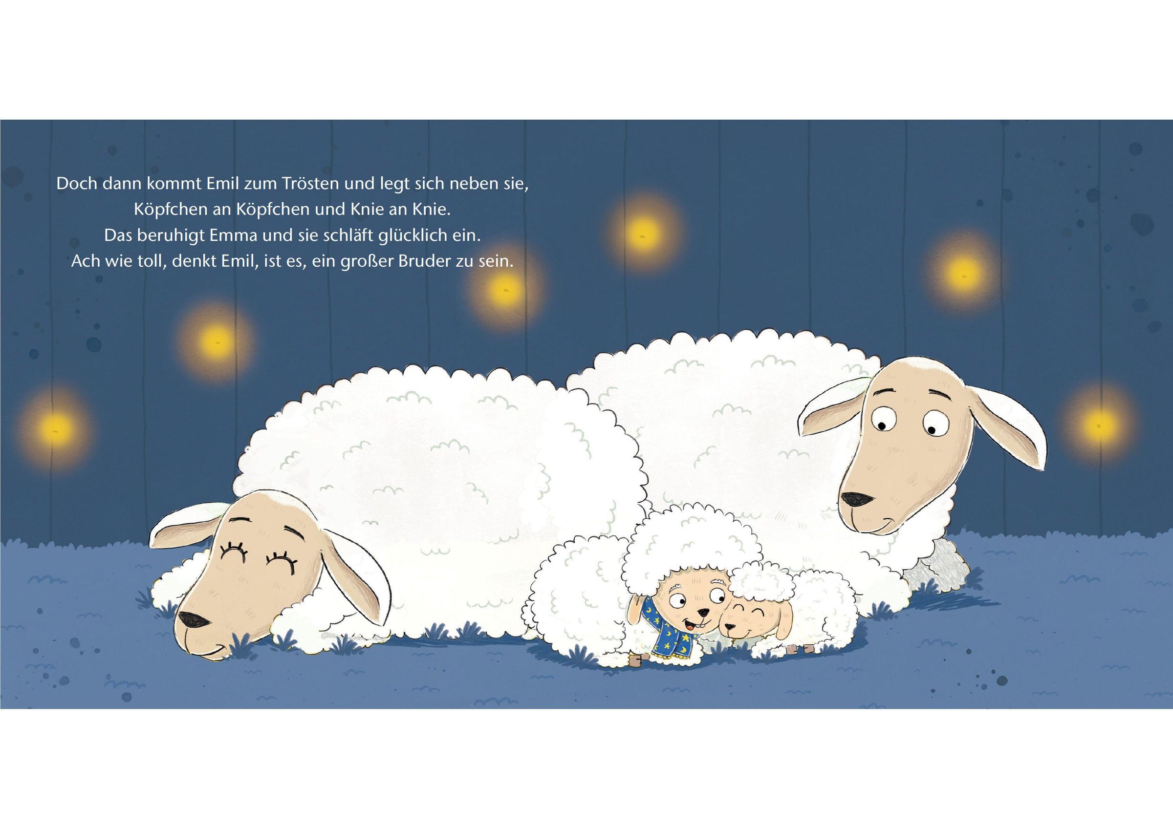 Aufregung im Schafstall! Emil, das kleine Einschlafschaf, bekommt ein Schwesterchen und freut sich sehr. Doch kaum ist das Baby auf der Welt, haben Mama und Papa nur noch wenig Zeit, mit ihm zu spielen. Als die kleine Emma etwas größer wird, kann Emil ihr all seine Lieblingswiesen zeigen. Fürchtet sie sich vor der Dunkelheit, tröstet Emil sie liebevoll. Überhaupt ist es einfach toll, ein großer Bruder zu sein!