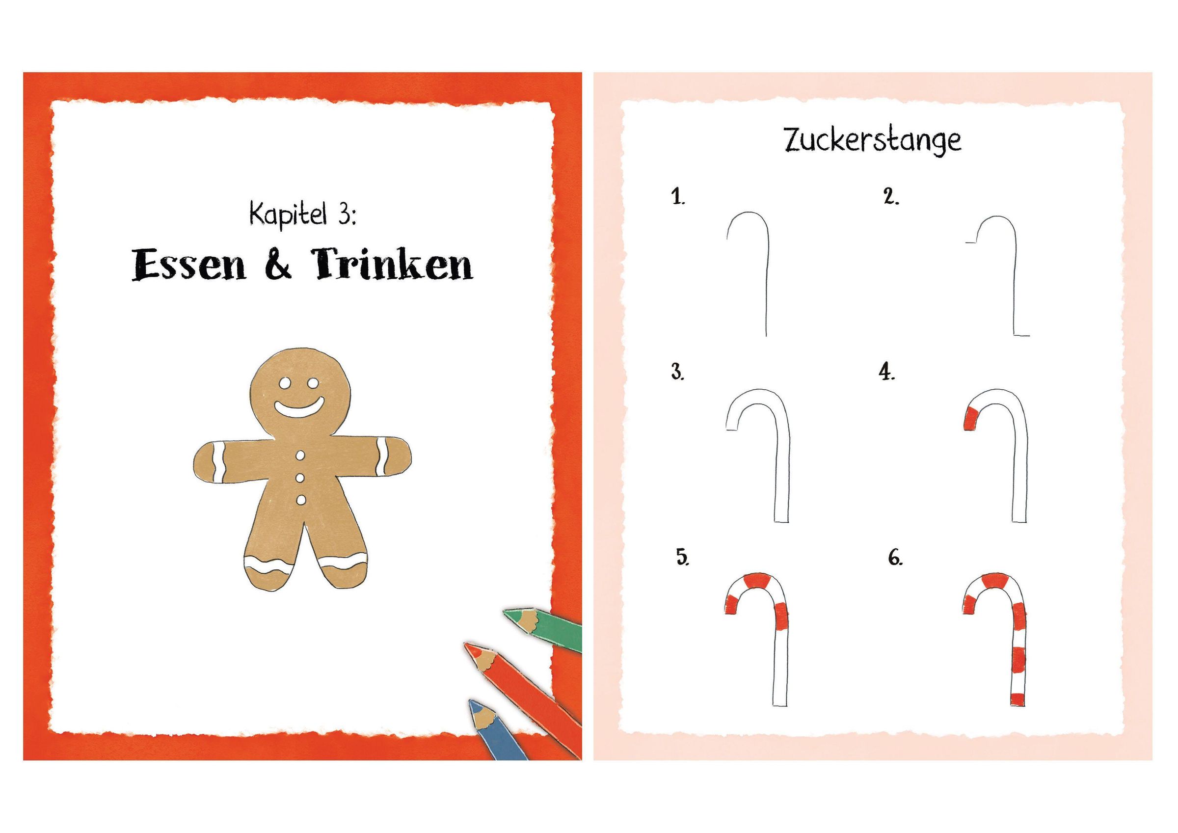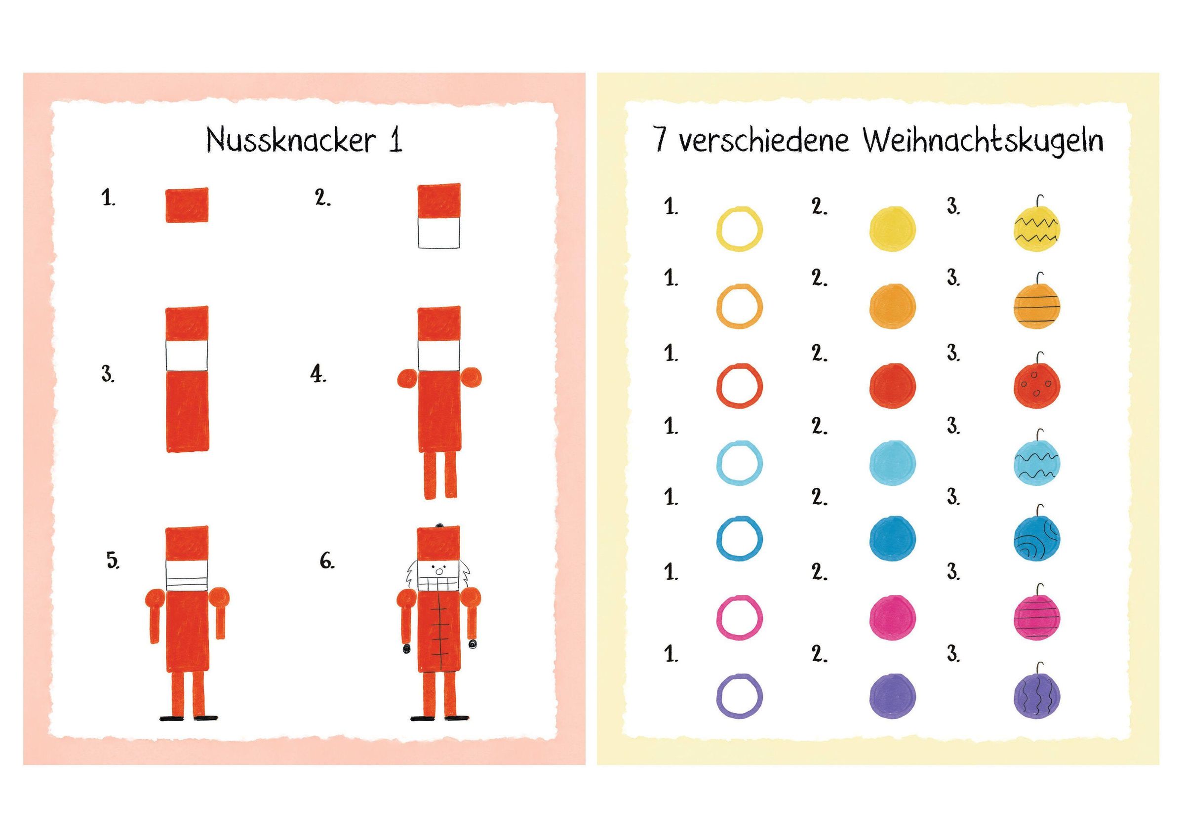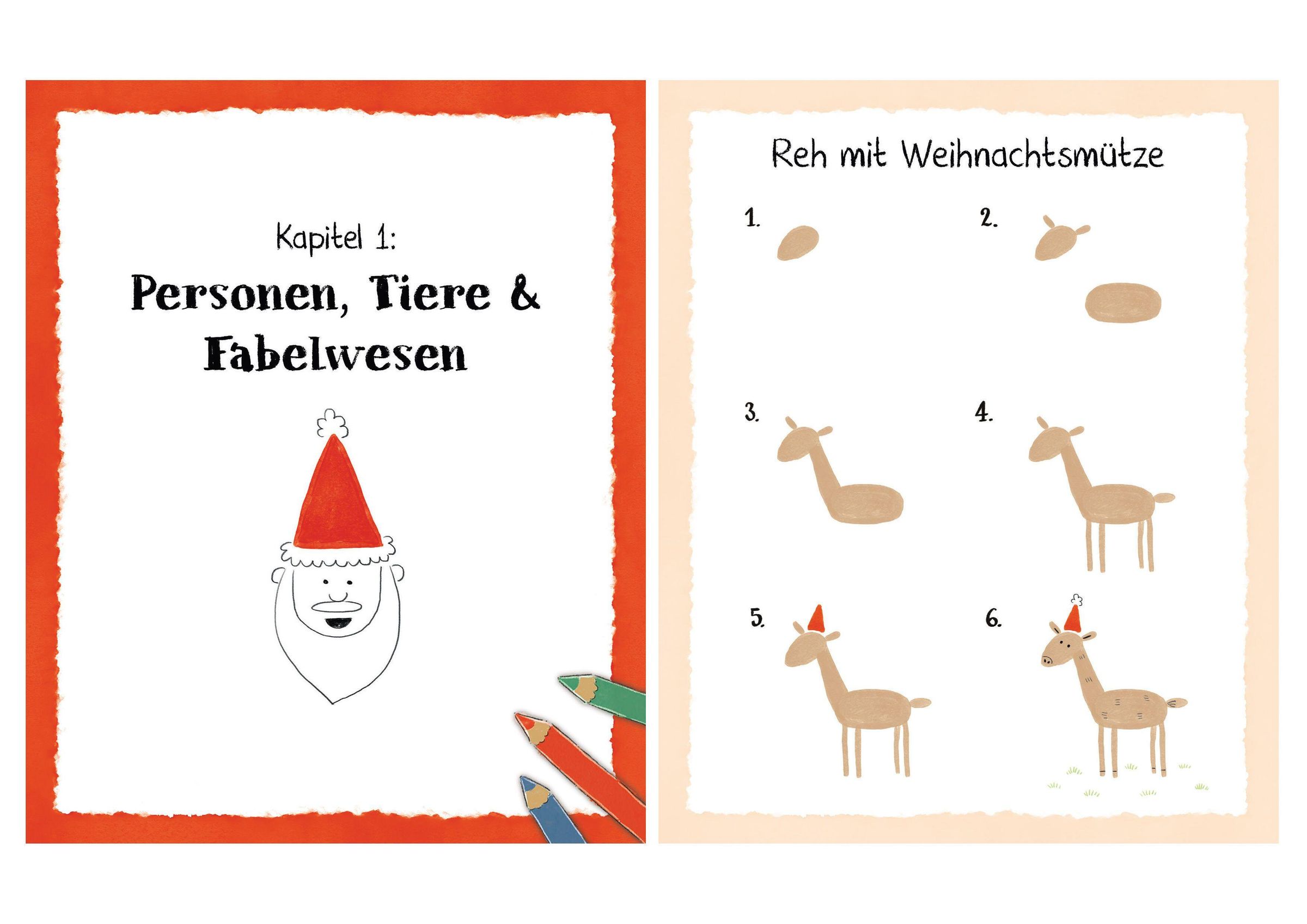Weihnachtsmann, Nikolaus, Tannenbaum, Weihnachtsengel, Plätzchen, Geschenke oder Adventskranz - diese Zeichenschule für Kinder ab 4 Jahren bietet über 100 Motive rund um Weihnachten zum Nachzeichnen. Das geht ganz leicht: Zunächst werden Schritt für Schritt die Grundformen der Figur gemalt, anschließend folgen die Details. So entsteht z. B. aus einem Dreieck die Mütze vom Weihnachtsmann. Der Vorteil: Beim Gestalten mit Flächen wird noch nicht ganz so viel Planung und Genauigkeit wie beim Zeichnen von Umrisslinien benötigt. Das erhöht das Erfolgserlebnis der kleinen Zeichenkünstler und den Spaß.