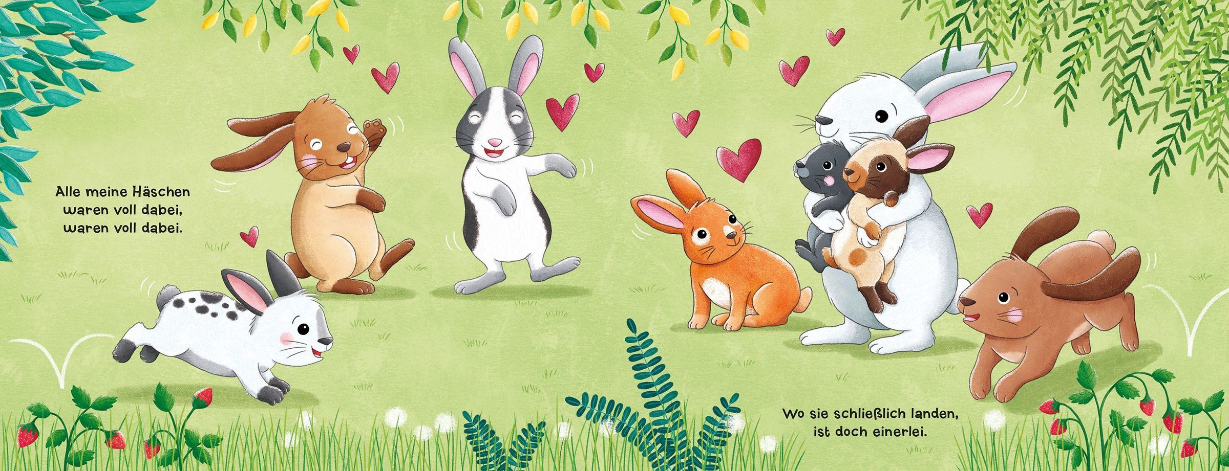„Alle meine Häschen hoppeln um den See.“ Ein See, umgeben von hüpfenden Häschen, Enten und Natur. Charmante Illustration., Buch