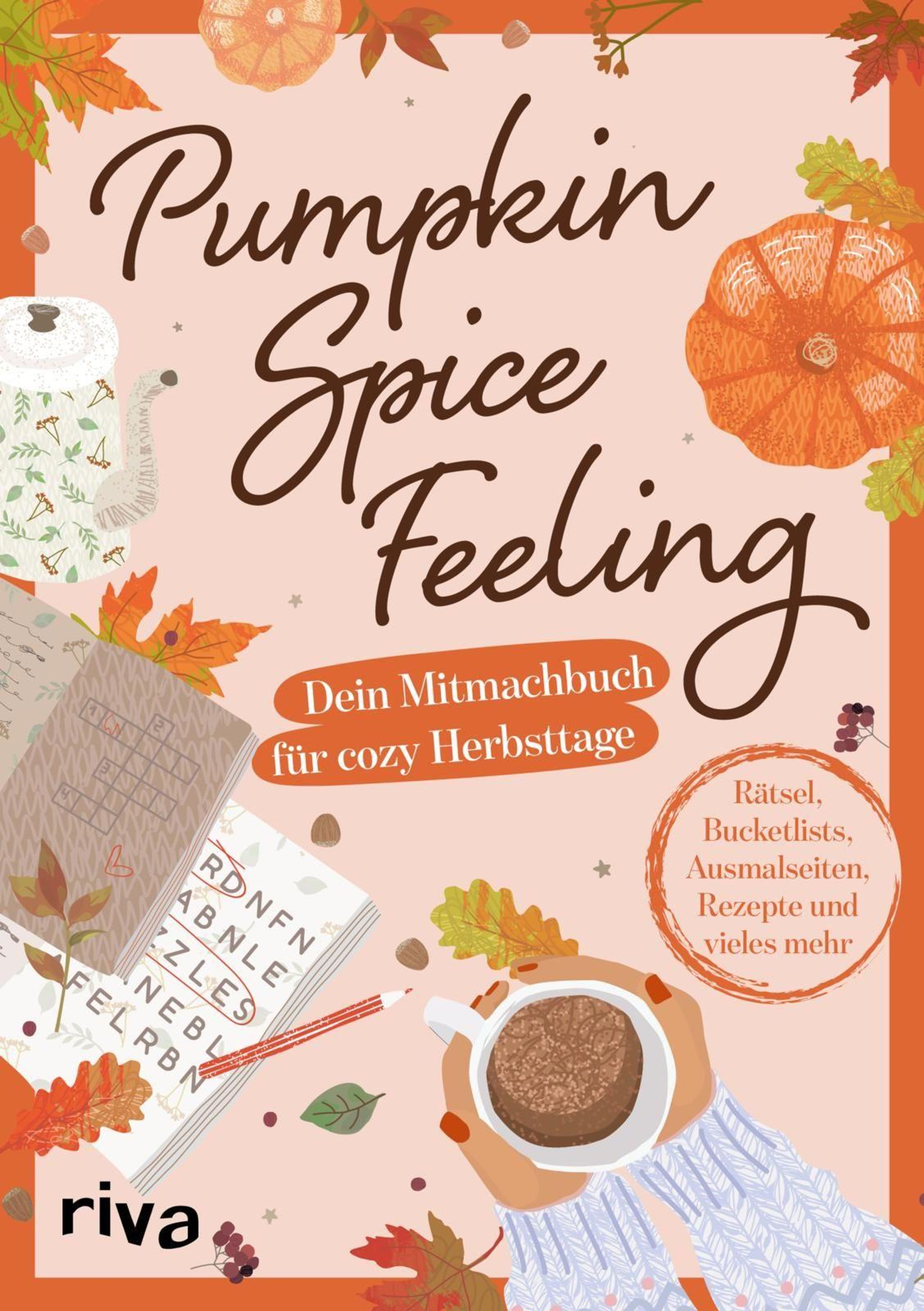 "Pumpkin Spice Feeling" und "Dein Mitmachbuch für cozy Herbsttage" in der Mitte, umgeben von herbstlichen Illustrationen., Buch
