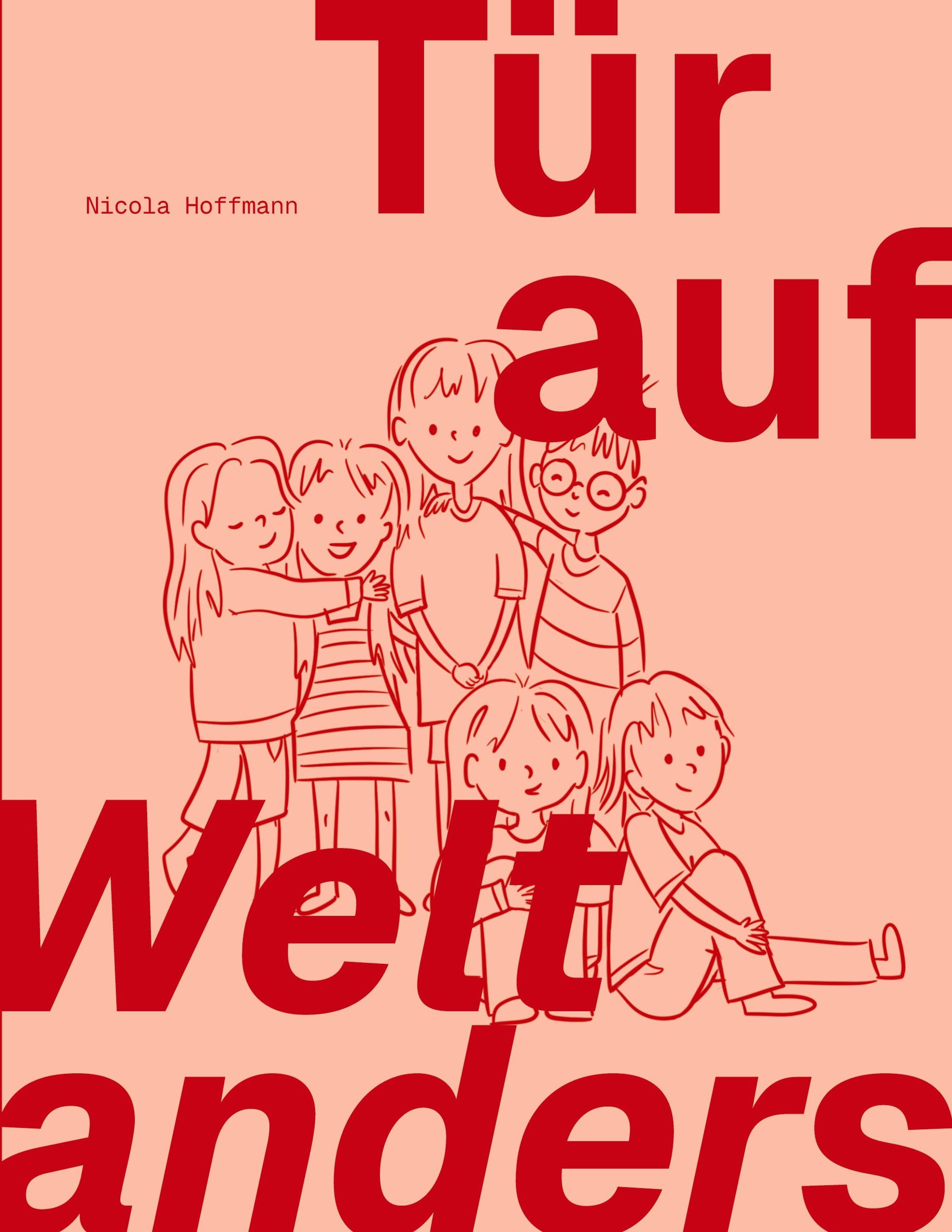 „Tür auf, Welt anders“. Illustration von sechs Kindern, lächelnd und beieinander stehend oder sitzend., Buch