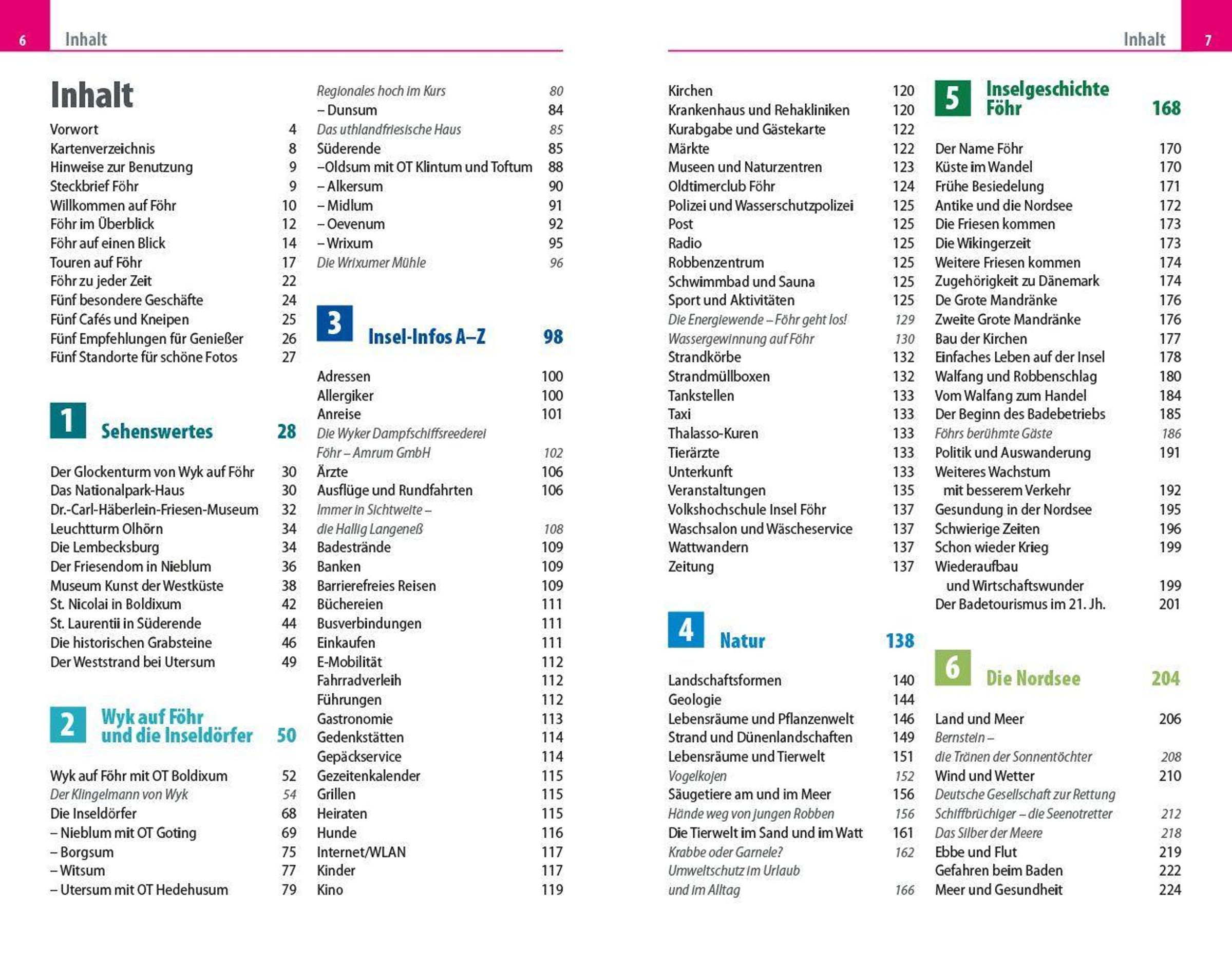 Ob zu Fuß, mit Fahrrad oder Boot:¿Die¿Autoren nehmen die Leser mit zu einer Erkundungstour über die kleine Nordseeinsel, geben ausführliche¿Beschreibungen aller sehenswerten Orte und laden zu Inselrundfahrten, Ausflügen zu Seehundbänken oder einem Besuch der Nachbarinseln und den Halligen Hooge, Langeneß und Gröde ein. Und sie empfehlen die Insel gleichsam als eine Therapie für den überlasteten modernen Menschen: "Die bereichernden Eindrücke der¿Natur erfreuen das Herz und die Seele kommt zur Ruhe. Föhr ist ohne Zweifel ein hervorragender Platz für Erholung,¿Entspannung und vielfältige Entdeckungen."
