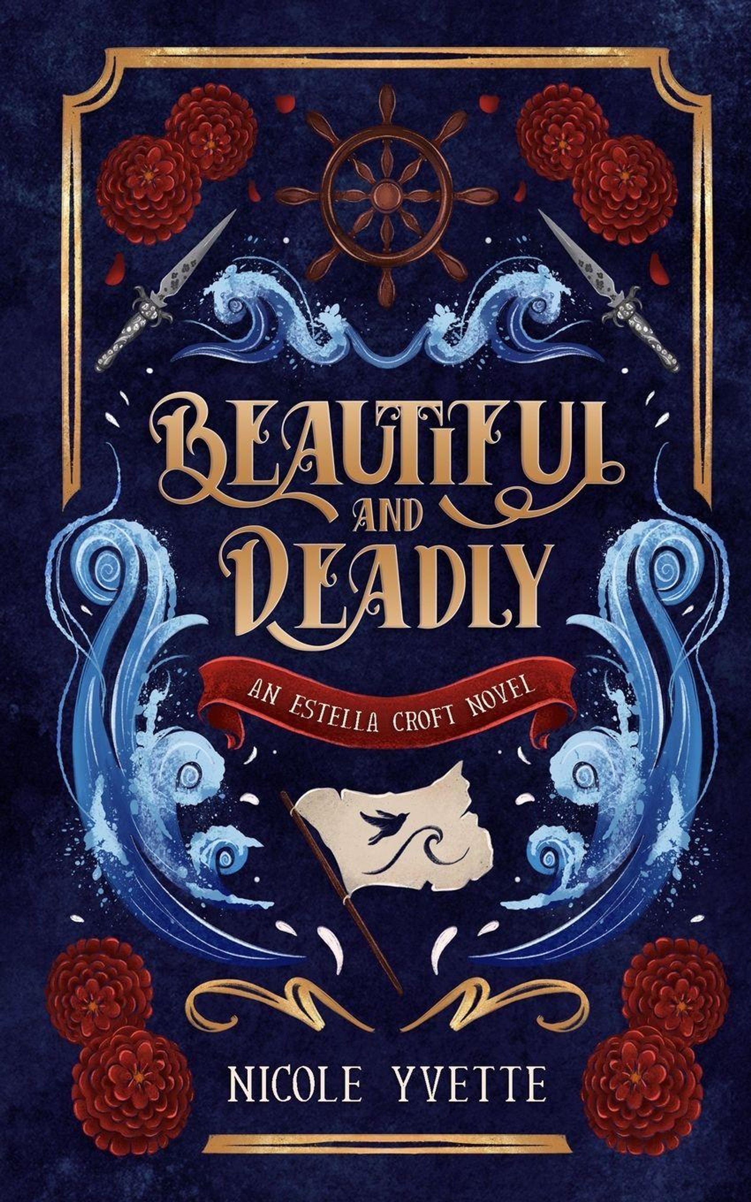 "Beautiful and Deadly", "An Estella Croft Novel", "Nicole Yvette". Illustration mit Blumen, Wellen, Dolchen, Steuerrad., Buch