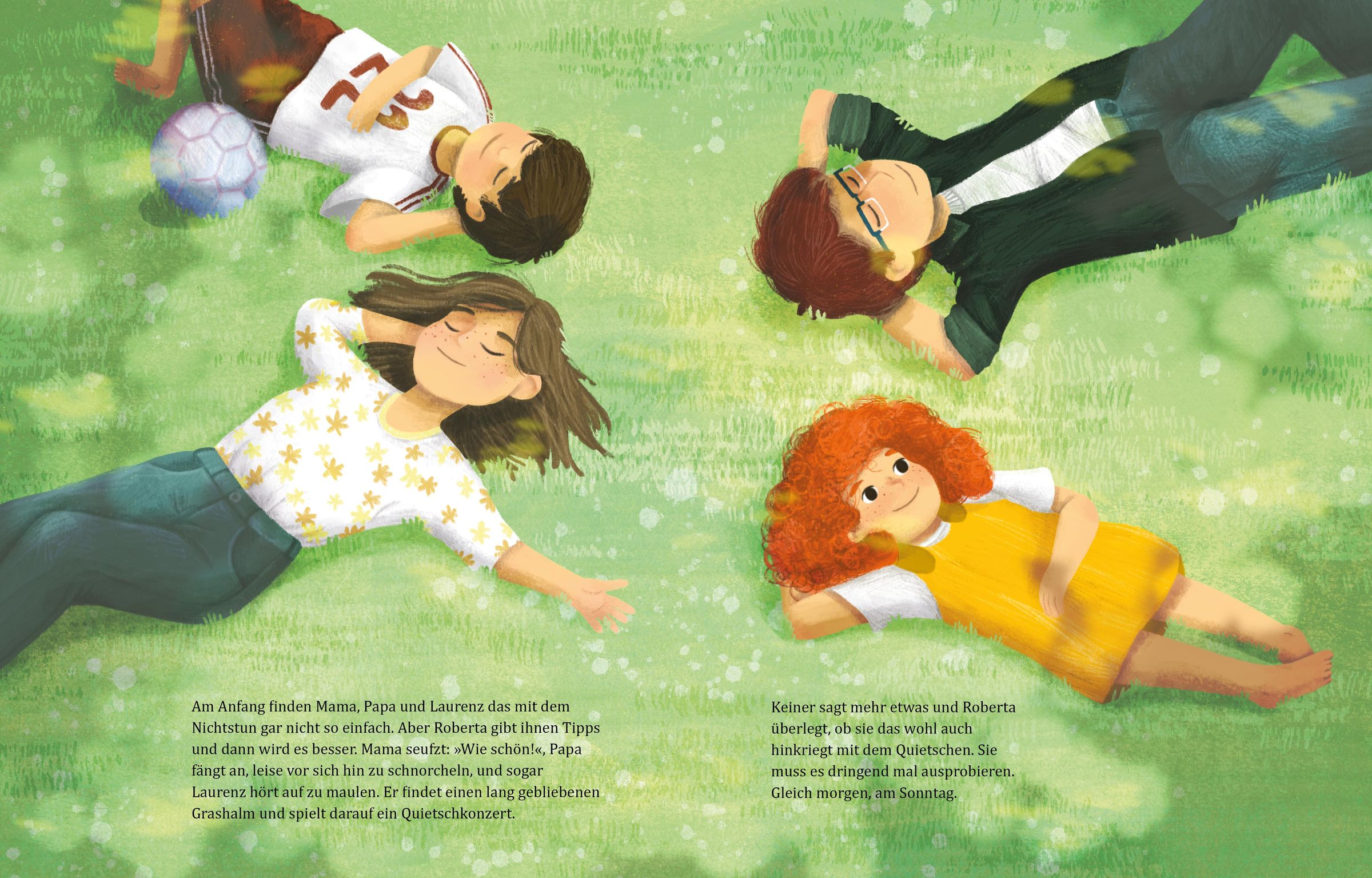 Roberta weiß genau, was sie heute machen will: gar nichts! Außer ein bisschen Vor-sich-hin-Träumen vielleicht. Doch das ist gar nicht so einfach, wenn ihre Familie zwischen Fußballtraining, Rasenmähen und Spielerunden jede Menge Vorschläge dafür hat, wie Roberta einen wirklich schönen Tag verbringen könnte. Zum Glück lässt sich Roberta nicht von ihrem Plan abbringen und hat eine herrliche Zeit beim Herumliegen. Wird sie ihre Familie auch noch davon überzeugen einfach mal nichts zu tun?