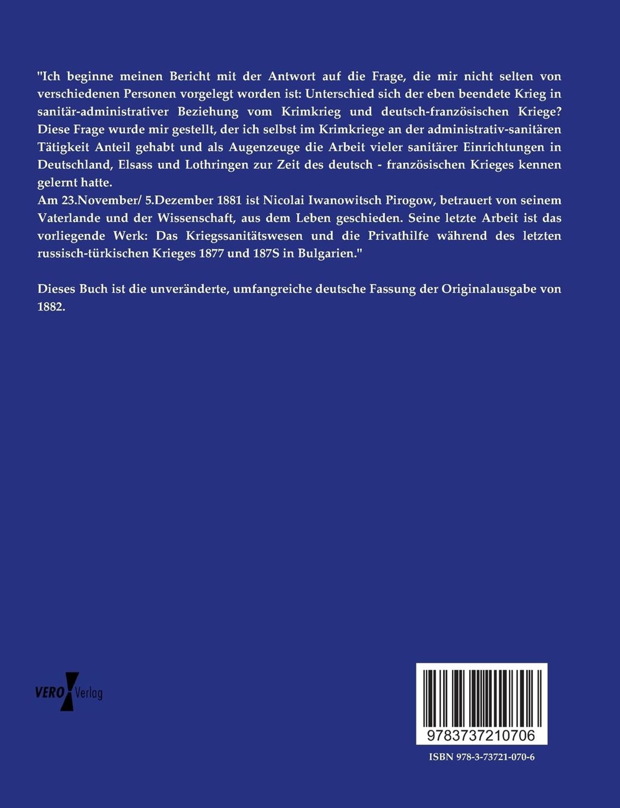\"Ich beginne meinen Bericht mit der Antwort auf die Frage, die mir nicht selten von verschiedenen Personen vorgelegt worden ist: Unterschied sich der eben beendete Krieg in sanitär-administrativer Beziehung vom Krimkrieg und deutsch-französischen Kriege? Diese Frage wurde mir gestellt, der ich selbst im Krimkriege an der administrativ-sanitären Tätigkeit Anteil gehabt und als Augenzeuge die Arbeit vieler sanitärer Einrichtungen in Deutschland, Elsass und Lothringen zur Zeit des deutsch - französischen Krieges kennen gelernt hatte. Am 23.November/ 5.Dezember 1881 ist Nicolai Iwanowitsch Pirogow, betrauert von seinem Vaterlande und der Wissenschaft, aus dem Leben geschieden. Seine letzte Arbeit ist das vorliegende Werk: Das Kriegssanitätswesen und die Privathilfe während des letzten russisch-türkischen Krieges 1877 und 187S in Bulgarien.\"
