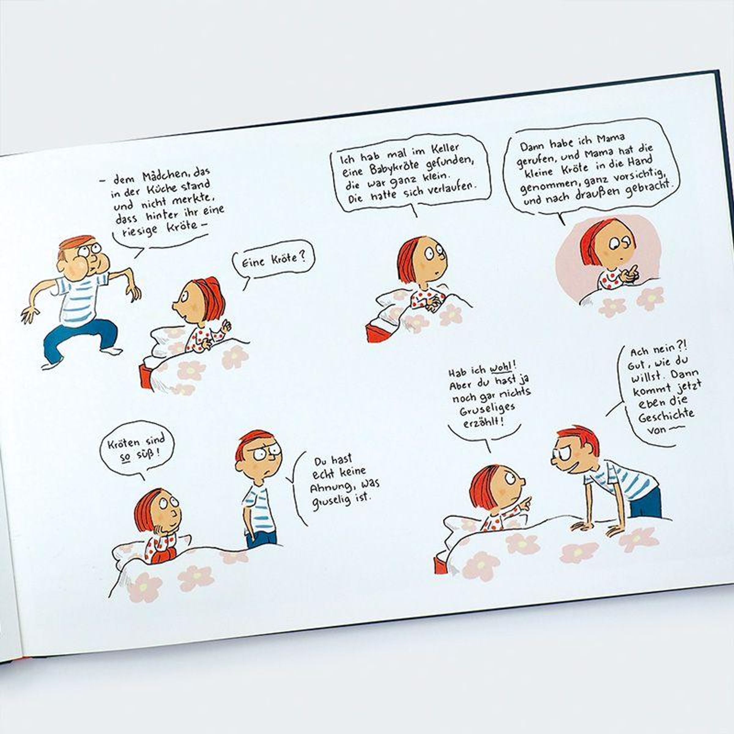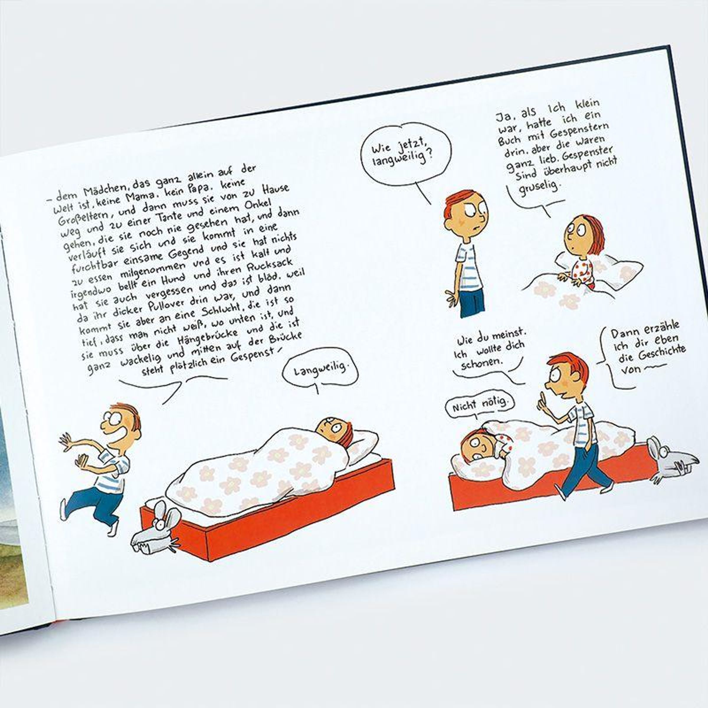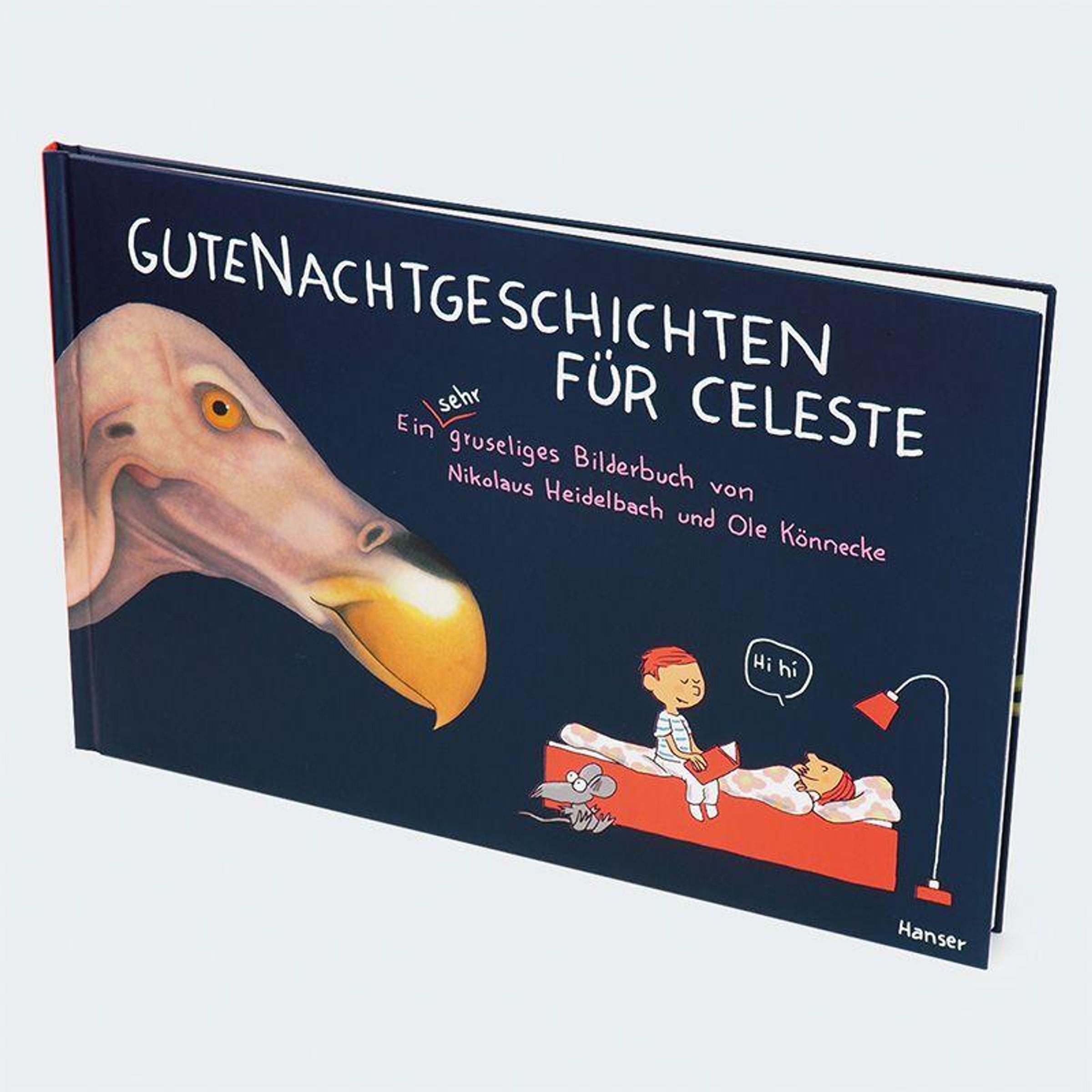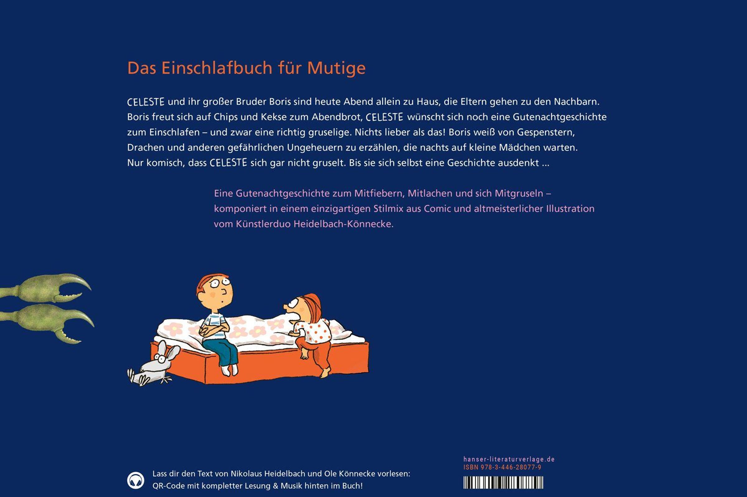 Das Einschlafbuch für Mutige. Höchst originell illustriert und mit Witz erzählt von Nikolaus Heidelbach und Ole Könnecke. Heute Abend sind Boris und Celeste allein zu Haus, die Eltern gehen zu den Nachbarn. Boris ist begeistert, endlich Chips und Kekse zum Abendbrot! Celeste will unbedingt noch eine Gutenachtgeschichte hören - und zwar eine richtig gruselige. Nichts lieber als das! Boris weiß von schrecklichen Gespenstern zu erzählen, die nachts auf kleine Mädchen warten ... Langweilig, findet Celeste. Oder von gefährlichen Riesenkröten, die sich heimlich anschleichen. Aber Kröten findet Celeste süß. Sogar über Drachen, menschenfressende Echsen und mehrköpfige Ungeheuer macht sich Celeste lustig. Sie gruselt sich einfach nicht. Bis sie sich selbst eine Geschichte ausdenkt, die Boris dann das Fürchten lehrt.