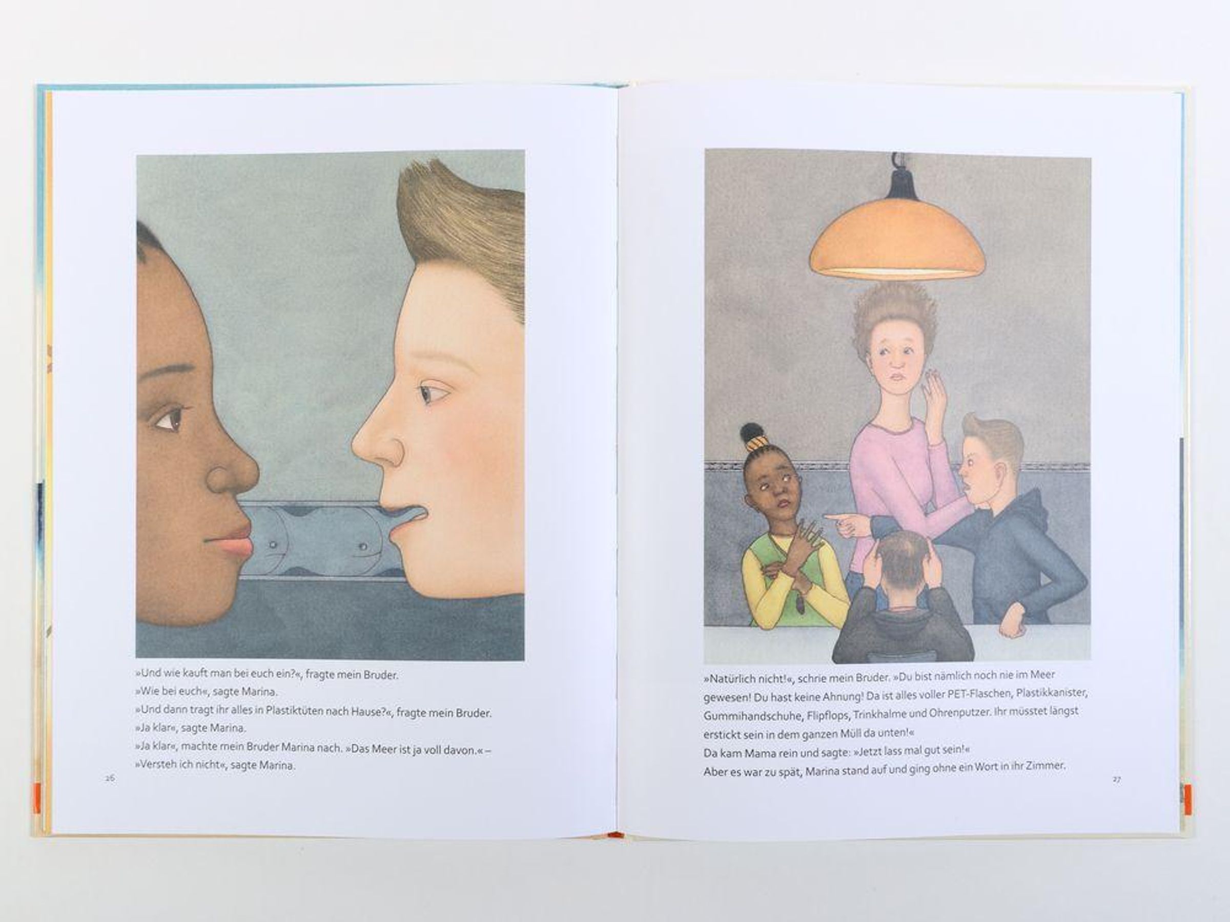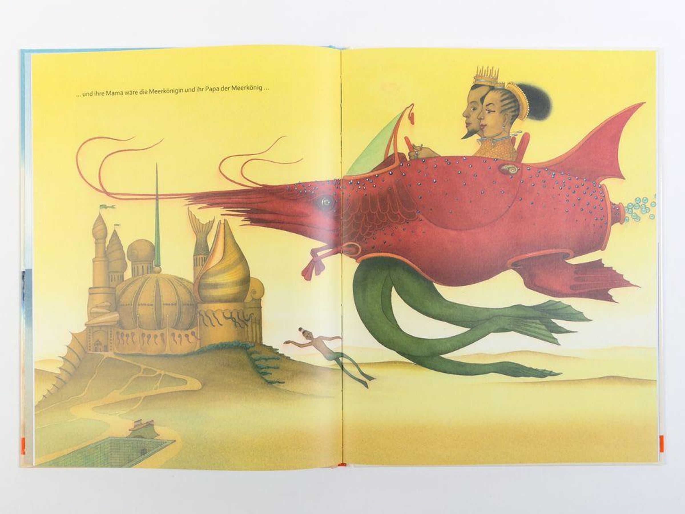 Zwei Brüder finden ein fremdes Mädchen am Strand und nehmen sie mit nach Hause. Marina ist zunächst stumm wie ein Fisch, dann sprudelt es aus ihr heraus: Sie behauptet, eine Meerprinzessin zu sein, erzählt von Schlössern unter Wasser, Autos mit Flossen und unglaublichen Korallenriffs mit Achterbahn. Die beiden Jungen streiten, ob sie Marina glauben sollen oder ob alles nur ihrer blühenden Fantasie entspringt. Da wird es Marina zu bunt. Ein faszinierendes Bilderbuch des preisgekrönten Illustrators Nikolaus Heidelbach, das ungeahnte Tiefen und ein großes Geheimnis hat.