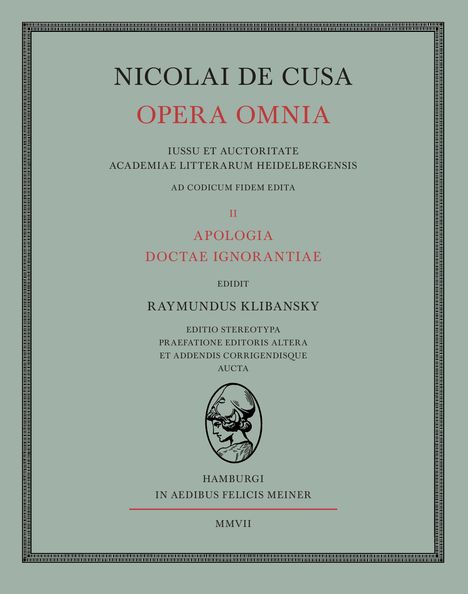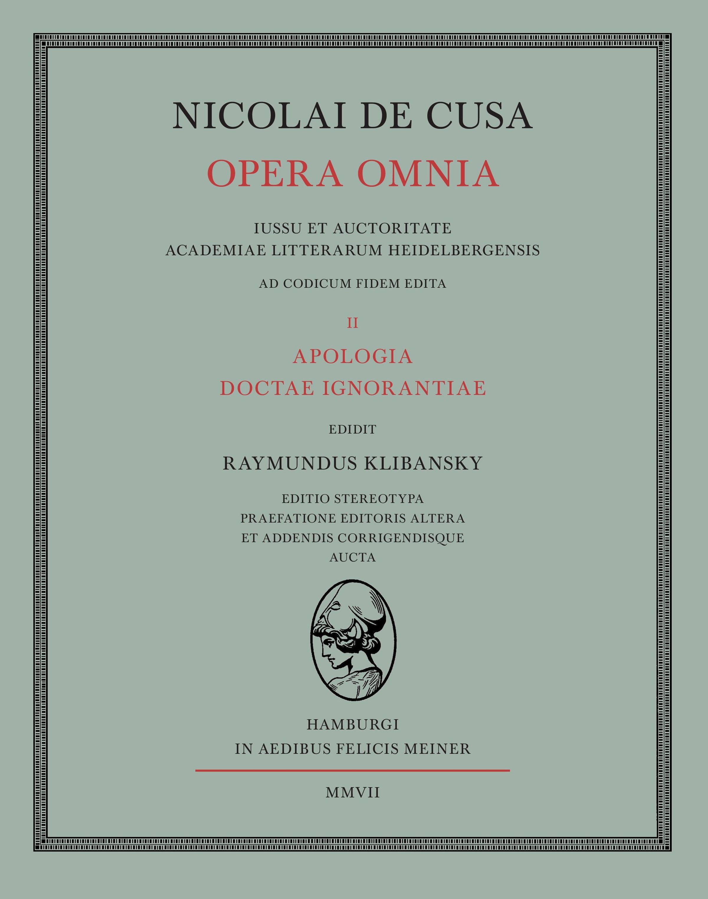Nikolaus von Kues antwortet mit seiner "Apologia doctae ignorantiae" von 1449 auf eine heftige Kritik Johannes Wenck von Herrenbergs an seiner ersten großen Schrift "De docta ignorantia" von 1440. Mit der Edition der "Apologia doctae ignorantiae" durch Raymond Klibansky wurde 1932 die Heidelberger Akademie-Ausgabe der Opera omnia des Nicolaus Cusanus begonnen. Die zweite Auflage dieser Edition enthält eine Praefatio von Raymond Klibansky sowie in einem Anhang zur Praefatio Zusätze und Korrekturen der Erstausgabe